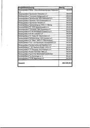 Projektbezeichnung Kraftsportverein 09 "Deutsche Eiche” - Deutsche Meisterschaft 3.000,00 € der Männer im Ringen aarlouis-Roden - Drei-Königs-Turnier/18. Bitburger-Cup in 500,00 € Saarlouis Saarl. Sportjournalisten - "Wahl der Saar-Sportler des Jahres 5.000,00 € 2008" in Saarbrücken eubau Sportheim DJK St. Ingbert 45.000,00 25.000,00 € 250,00 250,00 250,00 250,00 250,00 250,00 250,00 250,00 250,00 250,00 250,00 100,00 150,00 € ereinsjubiläum FV 08 Püttlingen ereinsjubiläum FSG 08 Schiffweiler ereinsjubiläum FC 09 Niederwürzbach ereinsjubilaum Sportgemeinde Hassel e.V. ereinsjubiläum 1. FC Riegelsberg ereinsjubiläum TV 08 Niederwürzbach e.V. ereinsjubiläum TV Germania Nalbach ereinsjubiläum Fußballclub 08 Elm e.V. ereinsjubiläum Sportverein Kirkel e.V. ereinsjubiläum Schwimmverein 08 Saarbrücken e.V. ereinsjubiläum Athleten-Sport-Verein Hüttigweiler e.V. ereinsjubiläum 1. MGC Saar 68 St. Ingbert e.V. ereinsjubiläum Sportverein "Blies" Bliesen e.V., Fußball Vereinsjubiläum Saarl. Tennisbund e.V. 100,00 ereinsjubiläaum TC Blau-Weiß Ottweiler e.V. 250,00 Vereinsjubiläum Sport Club 07 Fenne e.V. 250,00 Vereinsjubiläum FC "Hertha" Wiesbach e.V. 250,00 150,00 € 250,00 150,00 250,00 < SIsSIsIsisisiFessTesse zZ D 9.2 = . = ®D Sg oc 3& OO c N 5 1 a D =. oO = Z > a 1 © “n Q cz oO = zZ ©, 3 a @® & S S & >» = = 2 > _ I © = © [= al alm| m am mm en men) nen an Vereinsjubiläum Schützenverein "Sebastian Seelbach" e.V. ereinsjubiläaum Turnverein Siersburg e.V. ereinsjubiläum Basketballverband Saar e. V. ereinsjubilaum FC 08 Homburg e.V. 239.400,00 €