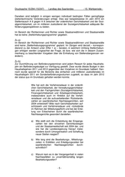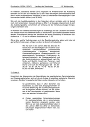 Drucksache 15/294 (15/247) Landtag des Saarlandes - 15. Wahlperiode - Hinsichtlich der Personalisierung im Bereich des einfachen, mittleren und gehobenen Dienstes wird dies insbesondere durch – für diesen Zweck geschaffene – Sondergrup- pen bzw. den Vertretungspool für den Bereich der Gerichte und Staatsanwaltschaften ermöglicht. In diesen organisatorischen Einheiten wird ein Personalbestand vorgehal- ten, der dazu bestimmt ist, gerade auch kurzfristig im Falle von auftretenden Vakanzen bei allen Justizbehörden für Abhilfe zu sorgen. Dies erfolgt dergestalt, dass zentral alle kurz- und langfristigen Ausfälle, die Kompensationen verlangen, an das Saarländische Oberlandesgericht gemeldet und dort in die vorliegenden Belastungszahlen eingepflegt werden. Auf dieser Basis erfolgen kurzfristige Personalzuteilungen. In diesem Zusam- menhang wird darauf hingewiesen, dass der vorstehend erwähnte Vertretungspool für die Gerichte und Staatsanwaltschaften in einem eigenen Haushaltskapitel abgebildet wurde (nunmehr 10 08, zuvor 05 65), worin zahlreiche Beamtenstellen des mittleren Dienstes sowie Beschäftigtenstellen angesiedelt sind. Dass diese Stellen nicht in der angeforderten Auflistung enthalten sind, liegt darin begründet, dass der Vertretungs- pool – auf der Basis des budgetierten Justizhaushaltes – kostenneutral funktioniert, da im Gegenzug auf die sonst üblichen Doppelbesetzungen und Leerstellen verzichtet wurde. Zu a): Derzeit wird beraten, in welchem Umfang in welchen Bereichen Personal abgebaut wird. Welche Stellenhebungen und welche Stellen- hebungsprogramme in der Justiz wurden seit 2004 durch die jetzige Landesregierung und die Vor- gängerregierung umgesetzt und wie viele Stellen, insbesondere im mittleren Dienst, wurden von Stellenhebungen in diesem Zeitraum begünstigt? a) Plant die Landesregierung im Justizbereich in den nächsten 5 Jahren Stellenhebungen und, wenn ja, in welchen Bereichen? Wenn nein, warum nicht? b) Wurde von Seiten der Landesregierung ein Beförderungsbudget zur Förderung der Moti- vation und leistungsgerechten Entlohnung der Justizbediensteten geschaffen? Wenn nein, warum nicht? Zu Frage 2: Im Bereich des einfachen Justizdienstes wurden in den vergangenen Haushaltsjahren zahlreiche Verbesserungen umgesetzt, wie beispielsweise die Anhebung aller 15 ver- bliebenen Wachtmeisterstellen der Besoldungsgruppe A 4 nach Besoldungsgruppe A 5 im Haushalt 2012. Daneben wurden zwei Stellen der Besoldungsgruppe A 7, die mit früheren Justizwachtmeistern (früherer Verwendungsaufstieg, jetzt Praxisaufstieg) be- setzt sind, nach Besoldungsgruppe A 8 gehoben. Bereits im Haushaltsjahr 2009 sind 5 Stellenhebungen von Besoldungsgruppe A 5 nach Besoldungsgruppe A 6 erfolgt, um die Beförderungssituation zu verbessern. Daneben wurden zwei Stellen mit Blick auf das Sicherheitsbedürfnis bzw. die Zunahme von Großprozessen neu geschaffen. Auch diese Neuschaffungen wurden in Besoldungsgruppe A 6 getätigt, mit Blick auf die Be- förderungsperspektiven, ebenso wie eine weitere Neuschaffung nach A 6 im Haushalt 2010. -3-