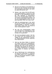 Drucksache 15/294 (15/247) Landtag des Saarlandes - 15. Wahlperiode - a) Wie hoch ist der Bedarf an Auszubildenden im Bereich der Justiz momentan und wie schätzt die Landesregierung den Bedarf in den nächs- ten Jahren 2013 bis 2017 ein? b) Werden in den Jahren 2013 bis 2018 genü- gend Ausbildungsplätze im Bereich der Justiz geschaffen, um das altersbedingte Ausschei- den vieler Mitarbeiter zu kompensieren? Wenn ja, wie viele Beschäftigte werden in die- sem Zeitraum altersbedingt ausscheiden und wie viele Ausbildungsplätze werden zum Aus- gleich geschaffen? Wenn nein, warum nicht? c) Sollte die Landesregierungen in den Jahren 2013 bis 2017 vorhaben, die Anzahl der freien Ausbildungsplätze zu reduzieren, in welcher Höhe werden Kosten durch die Einsparung dieser Ausbildungsplätzen erspart? d) Wie viele neue Ausbildungsplätze werden nach Planungen der Landesregierung im Be- reich der Justiz in den Jahren 2013 bis 2017 benötigt und neu geschaffen? e) Wie viele Auszubildende wurden in den letz- ten 5 Jahren nach ihrer Ausbildung für eine Tätigkeit bei den saarländischen Gerichten, der Staatsanwaltschaft und dem Justizminis- terium übernommen? f) Steht der Zahl offener Stellen im einfachen und mittleren Dienst und im Angestelltenver- hältnis eine ausreichende Zahl an Bewerbern gegenüber bzw. gibt es mehr Bewerber als freie Stellen? Wie gestaltet sich das prozentu- ale Verhältnis Bewerberzahl zu ausgeschrie- benen Stellen im einfachen und mittleren Dienst? g) Gibt es Bestrebungen der Landesregierung, die Bezahlung insbesondere im einfacheren und mittleren Dienst und im Angestelltenver- hältnis für Neubewerber attraktiver zu gestal- ten? Wenn ja, welche? -8-