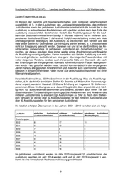 Drucksache 15/294 (15/247) Landtag des Saarlandes - 15. Wahlperiode - Es lässt sich allerdings festhalten, dass die durchgeführte Auswertung für das Jahr 2011 ein besseres Ergebnis als für das Jahr 2008 erbracht hat. Während die durch- schnittliche Dauer vom Antragseingang bis zur Weglegung im Jahr 2008 noch 99 Tage betrug, waren es im Jahr 2011 nur noch 72 Tage. Die vorgenannte Auswertung um- fasst sämtliche Erbscheinsverfahren, unabhängig davon, ob es um die Feststellung gesetzlicher oder testamentarischer Erbfolge ging. Zu c): Die Bearbeitungsdauer in Nachlassverfahren wird derzeit teilweise durch lange Bear- beitungszeiten im Schreibdienst negativ beeinflusst. Diese resultieren aus krankheits- bedingten Ausfällen, die mangels umzusetzenden Personals kurzfristig nicht behoben werden konnten. Das Amtsgericht Saarbrücken als größtes saarländisches Nachlassgericht wird derzeit umstrukturiert. Es wird auf eine vollständige Bearbeitung in Serviceeinheiten umge- stellt, während bisher die Erbscheine noch von einer reinen Schreibkraft ausgefertigt wurden. Hierzu ist eine Aufstockung der Serviceeinheiten um eine weitere Mitarbeiterin erfolgt, die sich gerade in der Einarbeitungsphase befindet. Es kann davon ausgegan- gen werden, dass sich die o. g. Bearbeitungszeiten in Kürze wieder reduzieren werden. Im Bereich der Sachbearbeitung durch Rechtspfleger/innen bestehen keine Rückstän- de. Die Bearbeitungsdauer liegt dort bei ca. 3 Tagen bis maximal 1 Woche. Die Bear- beitungsdauer der Anträge auf der Geschäftsstelle bis zur Vorlage an den Rechtspfle- ger beträgt 1 bis 2 Tage. Länger, nämlich derzeit bis zu 4 Monate, dauert die richterli- che Sachbearbeitung. Dies ist auf die zeitweilige Vakanz der Stelle und mehrere De- zernatswechsel zurückzuführen, aber auch dadurch bedingt, dass der Richter nur für die Erbscheine bei testamentarischer Erbfolge zuständig ist und diese Verfahren auf- grund der nicht immer eindeutigen Rechtslage eine grundsätzlich längere Bearbei- tungsdauer erfordern. Zu d): Verbesserungen im Bereich der Bearbeitungsdauer sind aufgrund der o. g. Umstruktu- rierung im Servicebereich sowie aufgrund des derzeit für das Amtsgericht Saarbrücken in der Planungs- und teilweise bereits in der Umsetzungsphase befindlichen Projekts „Erbschein 24“ zu erwarten, das in Rheinland-Pfalz bereits mit gutem Erfolg erprobt ist. Von diesen Maßnahmen werden insbesondere die Erbscheinsverfahren aufgrund ge- setzlicher Erbfolge profitieren. Zu e): Die aufgeworfene Frage hat sich bisher – soweit ersichtlich – nicht gestellt, da die Rü- ge einer überlangen Verfahrensdauer im Bereich des Nachlassgerichts bisher nicht erhoben und Entschädigungsansprüche nicht geltend gemacht wurden. Wie viele Ausbildungsplätze wurden in den Jahren 2004 bis 2012 in den Dienststellen der Justiz (saarländische Gerichte, Staatsanwaltschaft und Justizministerium) im Saarland bereitgestellt bzw. neu geschaffen? Bitte nach Jahren, Behörde und Laufbahngruppe untergliedern. -7-