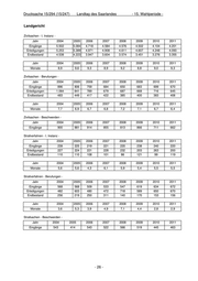 Drucksache 15/294 (15/247) Landtag des Saarlandes - 15. Wahlperiode - Landgericht Zivilsachen - I. Instanz - Jahr 2004 2005 2006 2007 2008 2009 2010 2011 Eingänge 5.502 5.084 4.718 4.584 4.576 4.502 4.104 4.201 Erledigungen 5.253 5.389 4.971 4.908 4.611 4.607 4.248 4.093 Endbestand 4.538 4.223 3.947 3.604 3.574 3.451 3.276 3.355 Jahr 2004 2005 2006 2007 2008 2009 2010 2011 Monate 8,9 9,6 9,3 8,9 9,2 8,8 9,0 9,3 Zivilsachen - Berufungen - Jahr 2004 2005 2006 2007 2008 2009 2010 2011 Eingänge 896 806 759 684 650 683 699 670 Erledigungen 1.064 841 789 679 687 668 716 645 Endbestand 483 449 417 422 385 400 383 408 Jahr 2004 2005 2006 2007 2008 2009 2010 2011 Monate 7,7 6,9 6,7 6,8 7,2 7,1 6,7 6,4 Zivilsachen - Beschwerden - Jahr 2004 2005 2006 2007 2008 2009 2010 2011 Eingänge 900 881 914 855 813 866 711 662 Strafverfahren - I. Instanz - Jahr 2004 2005 2006 2007 2008 2009 2010 2011 Eingänge 239 225 219 221 220 238 240 220 Erledigungen 227 224 221 228 232 203 263 200 Endbestand 110 110 108 101 86 121 99 119 Jahr 2004 2005 2006 2007 2008 2009 2010 2011 Monate 5,6 5,6 4,3 6,1 5,9 5,4 5,5 5,5 Strafverfahren - Berufungen - Jahr 2004 2005 2006 2007 2008 2009 2010 2011 Eingänge 568 568 509 533 547 619 634 672 Erledigungen 482 603 480 472 718 589 650 670 Endbestand 256 219 250 311 140 170 153 156 Jahr 2004 2005 2006 2007 2008 2009 2010 2011 Monate 3,6 5,3 3,9 4,9 7,1 4,4 2,8 2,9 Strafsachen - Beschwerden - Jahr 2004 2005 2006 2007 2008 2009 2010 2011 Eingänge 543 414 543 522 566 519 445 463 - 26 -