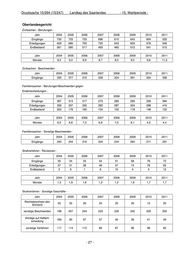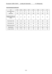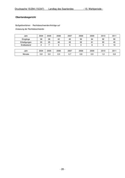 Drucksache 15/294 (15/247) Landtag des Saarlandes - 15. Wahlperiode - Oberlandesgericht Bußgeldverfahren - Rechtsbeschwerden/Anträge auf Zulassung der Rechtsbeschwerde - Jahr 2004 2005 2006 2007 2008 2009 2010 2011 Eingänge 38 28 42 45 50 64 92 90 Erledigungen 35 25 46 43 52 61 93 45 Endbestand 4 7 3 5 3 6 5 10 Jahr 2004 2005 2006 2007 2008 2009 2010 2011 Monate 0,8 3,0 2,0 0,7 0,8 0,9 1,0 0,8 - 28 -