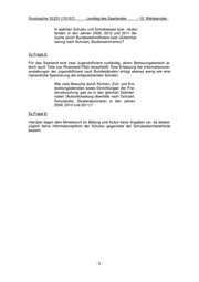 Drucksache 15/231 (15/167) Landtag des Saarlandes - 15. Wahlperiode - In welchen Schulen und Schulklassen bzw. -stufen fanden in den Jahren 2009, 2010 und 2011 Be- suche durch Bundeswehroffiziere statt (Aufschlüs- selung nach Schulart, Studienseminaren)? Zu Frage 5: Für das Saarland sind zwei Jugendoffiziere zuständig, deren Betreuungsbereich je- doch auch Teile von Rheinland-Pfalz einschließt. Eine Erfassung der Informationsver- anstaltungen der Jugendoffiziere nach Bundesländern erfolgt ebenso wenig wie eine namentliche Speicherung der entsprechenden Schulen. Wie viele Besuche durch Kirchen, Zivil- und Ent- wicklungsdiensten sowie Einrichtungen der Frie- densforschung gab es in den gleichen Zeitinter- vallen (Aufschlüsselung ebenfalls nach Schulart, Schulstufen, Studienseminaren in den Jahren 2009, 2010 und 2011)? Zu Frage 6: Hierüber liegen dem Ministerium für Bildung und Kultur keine Angaben vor, da diesbe- züglich keine Informationspflicht der Schulen gegenüber der Schulaufsichtsbehörde besteht. -3-