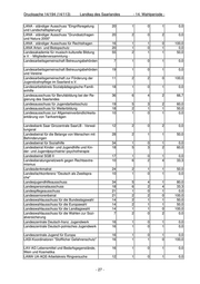 Drucksache 14/194 (14/113) Landtag des Saarlandes - 14. Wahlperiode - Kontaktausschuss für Flüchtlingsfragen im Saar- 11 5 2 3 40,0 land Kontaktstelle für Wissens- und Technologietrans- 10 1 1 0 100,0 fer der Universität des Saarlandes Koordinationsstelle Floristische Kartierung 40 2 0 2 0,0 Deutschlands Koordinierungsausschuss Börse 16 1 0 1 0,0 Koordinierungsausschuss Fachinformationssys- 17 1 0 1 0,0 tem Agrar (FIS-ELV) Koordinierungsausschuss Fachinformationssys- 17 1 0 1 0,0 teme der Ernährungs-, Land- und Forstwirtschaft (FISA) Koordinierungsausschuss für die Abstimmung 16 1 1 0 100,0 von Ausbildungsordnungen und KMK- Rahmenlehrplänen Koordinierungsausschuss zur Förderung der 5 1 1 0 100,0 Zusammenarbeit zwischen den Unfallversiche- rungsträgern und den staatlichen Arbeitsschutz- behörden im Saarland Koordinierungsausschuss zur Gewährleistung 17 1 0 1 0,0 der einheitlichen beruflichen Bildung der Steuer- beamten Koordinierungskreis "Nanotechnologie" des 17 1 0 1 0,0 BMBF Kulturstiftung der Länder - Stiftungsinterne AG - 17 1 1 0 100,0 Kunst- und Ausstellungshalle des Bundes - Kura- 17 1 1 0 100,0 torium - Kuratorium der Akademie für Arbeit und Sozial- 12 1 0 1 0,0 wesen (AfAS) Kuratorium der CJD Homburg/Saar gGmbH 6 2 0 2 0,0 Kuratorium der Fachhochschule für Finanzen, 18 1 0 1 0,0 Edenkoben Kuratorium der Staatlichen Vogelschutzwarte 4 1 0 1 0,0 Kuratorium des Arbeitstrainings- u. Therapiezent- 8 1 0 1 0,0 rums (ATZ) für psychisch Kranke u. Behinderte, anerkannte Reha-Einrichtung (RPK) der SHG Saarbrücken Kuratorium des Oberprüfungsamtes 35 1 0 1 0,0 Kuratorium für Wald- und Forstwirtschaft 43 1 0 1 0,0 Kuratorium IZFP 17 1 0 1 0,0 Kuratorium Prüfungsausschuss Betriebsleiter BO 17 1 0 1 0,0 Strab LA KoopUis (Kooperationen und Entwicklungen 18 1 1 0 100,0 von Software für Umweltinformationssysteme) LABO-Ausschuss Altlasten 19 1 1 0 100,0 LABO-Ausschuss Recht 24 1 1 0 100,0 Länder-Arbeitsgemeinschaft "Rückführung" (AG 16 1 0 1 0,0 Rück) der IMK Länder-Fachgespräch "Emissionskataster" 24 1 0 1 0,0 Länder-Referentenbesprechung "Luftfahrt" 16 1 1 0 100,0 Länderarbeitsgemeinschaft "Leiter der Beschei- 17 1 0 1 0,0 nigenden Stellen" Länderarbeitsgemeinschaft Abfall (LAGA) 19 1 0 1 0,0 - 25 -