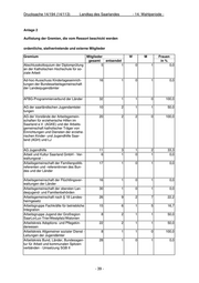 Drucksache 14/194 (14/113) Landtag des Saarlandes - 14. Wahlperiode - Anlage 2 Auflistung der Gremien, die vom Ressort beschickt werden ordentliche, stellvertretende und externe Mitglieder Gremium Mitglieder W M Frauen gesamt entsendet in % Abschlusskolloquium der Diplomprüfung 5 1 0 1 0,0 an der Katholischen Hochschule für so- ziale Arbeit Ad-hoc-Ausschuss Kindertageseinrich- 16 1 0 1 0,0 tungen der Bundesarbeitsgemeinschaft der Landesjugendämter AFBG-Programmierverbund der Länder 32 1 1 0 100,0 AG der saarländischen Jugendamtslei- 10 2 1 1 50,0 tungen AG der Vorstände der Arbeitsgemein- 20 2 2 0 100,0 schaften für erzieherische Hilfen im Saarland e.V. (AGKE) und der Arbeits- gemeinschaft katholischer Träger von Einrichtungen und Diensten der erziehe- rischen Kinder- und Jugendhilfe Saar- land (AGH) und LJ AG Jugendhilfe 11 3 1 2 33,3 Arbeit und Kultur Saarland GmbH - Ver- 6 1 0 1 0,0 waltungsrat - Arbeitsgemeinschaft der Familienpolitik- 17 1 0 1 0,0 referenten und -referentinnen des Bun- des und der Länder Arbeitsgemeinschaft der Flüchtlingsver- 16 1 0 1 0,0 waltungen der Länder Arbeitsgemeinschaft der obersten Lan- 30 1 0 1 0,0 desjugend- und Familienbehörden Arbeitsgemeinschaft nach § 18 Landes- 26 9 2 7 22,2 heimgesetz Arbeitsgruppe Fachkräfte für betriebliche 15 6 1 5 16,7 Integration Arbeitsgruppe Jugend der Großregion 8 2 1 1 50,0 SaarLorLux-Trier/Westpfalz/Walonien Arbeitskreis Adoptions- und Pflegekin- 22 2 1 1 50,0 derwesen Arbeitskreis Allgemeiner sozialer Dienst - 8 1 1 0 100,0 Leitungen der Jugendämter Arbeitskreis Bund, Länder, Bundesagen- 28 1 0 1 0,0 tur für Arbeit und kommunalen Spitzen- verbänden - Umsetzung SGB II - 39 -