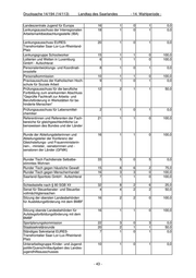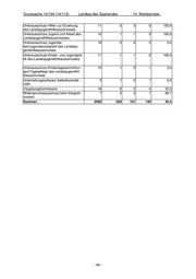 Drucksache 14/194 (14/113) Landtag des Saarlandes - 14. Wahlperiode - Unterausschuss Hilfen zur Erziehung 11 3 3 0 100,0 des Landesjugendhilfeausschusses Unterausschuss Jugend und Arbeit des 10 1 1 0 100,0 Landesjugendhilfeausschusses Unterausschuss Jugendar- 16 2 0 2 0,0 beit/Jugendsozialarbeit des Landesju- gendhilfeausschusses Unterausschuss Kinder- und Jugendpoli- 11 1 1 0 100,0 tik des Landesjugendhilfeausschusses Unterausschuss Kindertageseinrichtun- 10 1 0 1 0,0 gen/Tagespflege des Landesjugendhil- feausschusses Unterhaltungssoftware Selbstkontrolle - 5 1 0 1 0,0 USK Vergütungskommission 16 6 2 4 33,3 Widerspruchsausschuss beim Integrati- 7 3 2 1 66,7 onsamt Summen 2080 250 101 149 40,4 - 44 -