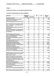 Drucksache 14/194 (14/113) Landtag des Saarlandes - 14. Wahlperiode - Anlage 3 Auflistung der Gremien, die vom Ressort beschickt werden ordentliche, stellvertretende und externe Mitglieder Gremium Mitglieder W M Frauen gesamt entsendet in % AG Medizinprodukte 33 1 0 1 0,0 AMI Arzneimitteluntersuchungsinstitut - 6 1 0 1 0,0 Nord GmbH - Aufsichtsrat AOLG-Arbeitsgruppe AG Infektionsschutz 16 1 1 0 100,0 AOLG-Arbeitsgruppe Arzneimittel, Apothe- 17 1 1 0 100,0 ken-, Transfusions-, und Betäubungsmit- telwesen AATB AOLG-Arbeitsgruppe Berufe des Gesund- 32 1 1 0 100,0 heitswesens AOLG-Arbeitsgruppe Gesundheitsbericht- 19 2 2 0 100,0 erstattung, Prävention, Rehabilitation und Sozialmedizin AOLG-Arbeitsgruppe Psychiatrie 18 1 0 1 0,0 AOLG-Länderarbeitsgruppe Umweltbezo- 20 2 0 2 0,0 gener Gesundheitsschutz Arbeitsgemeinschaft Bioethik und Recht 16 2 2 0 100,0 der AOLG Arbeitsgemeinschaft der obersten Landes- 16 2 1 1 50,0 gesundheitsbehörden AOLG Arbeitsgruppe Medizinprodukte 20 1 1 0 100,0 Arbeitskreis HIV/AIDS im Saarland 13 1 1 0 100,0 Arbeitskreis Prävention und Gesundheits- 12 1 1 0 100,0 förderung im Saarland Aufsichtsrat Drogenhilfezentrum 6 1 0 1 0,0 Ausschüsse der Bundesanstalt für Arbeits- 17 1 1 0 100,0 schutz und Arbeitsmedizin Ausschuss für Arbeitsstätten beim BMAS 17 1 1 0 100,0 Begleitausschuss für den Plan zur Entwick- 18 1 0 1 0,0 lung des ländlichen Raums im Saarland 2007 bis 2013 - ELER Beirat der Akademie für Gesundheit, Er- 5 2 0 2 0,0 nährung und Verbraucherschutz AGEV Beirat der Zentralstelle der Länder für Ge- 16 2 1 1 50,0 sundheitsschutz bei Arzneimitteln und Me- dizinprodukten ZLG Beirat für den Rettungsdienst 32 2 2 0 100,0 Bund-Länder Arbeitsgemeinschaft Influen- 17 2 1 1 50,0 za-Pandemieplanung Bund-Länder Arbeitsgemeinschaft Umset- 17 1 1 0 100,0 zung des IfSG Bund-Länder-Arbeitsgruppe Badegewässer 20 2 0 2 0,0 Bund-Länder-Koordinierungskreis AIDS 30 1 1 0 100,0 - 45 -