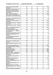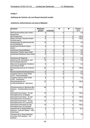 Drucksache 14/194 (14/113) Landtag des Saarlandes - 14. Wahlperiode - Haus der Geschichte der BRD - 32 2 2 0 100,0 Kuratorium - Ideenkreis im Ideennetz der saar- 12 2 0 2 0,0 ländischen Landesverwaltung IKS IndustrieKultur Saar GmbH - 9 2 1 1 50,0 Aufsichtsrat - KMK - Ausschuss für Kultur 16 1 1 0 100,0 Kommission für saarländische Lan- 20 1 0 1 0,0 desgeschichte und Volksforschung Kommission zur Deregulierung des 16 1 0 1 0,0 staatlichen Sektors Konferenz der Kulturminister der 10 1 1 0 100,0 Großregion Kulturstiftung der Länder - Stiftungs- 17 2 2 0 100,0 interne AG - Kulturstiftung der Länder - Stiftungs- 17 1 1 0 100,0 rat - Kunst- und Ausstellungshalle des 17 2 2 0 100,0 Bundes - Kuratorium - Landesakademie für musisch- 55 2 1 1 50,0 kulturelle Bildung e.V. - Mitglieder- versammlung - LEG Saar, Landesentwicklungsge- 7 1 0 1 0,0 sellschaft Saarland mbH - Auf- sichtsrat Lenkungsgruppe der regionalen 18 1 0 1 0,0 Strukturkonferenz Medienrat der Landesmedienanstalt 7 2 0 2 0,0 MP-Konferenz als Rundfunkkom- 16 1 0 1 0,0 mission Musikfestspiele Saar gGmbH - Bei- 5 1 0 1 0,0 rat - Ordensreferentenbesprechung 16 1 1 0 100,0 Personalentwicklungs- und Koordi- 8 2 0 2 0,0 nationsstelle Personalkommission 10 1 1 0 100,0 Projekt Lehrstelle jetzt 9 3 2 1 66,7 Projekt picobello 10 3 1 2 33,3 Red Point GmbH - Gesellschaft für 5 1 0 1 0,0 Marketing und Vertrieb GmbH - Aufsichtsrat - Rundfunkkommission auf CdS- 16 1 0 1 0,0 Ebene Saarländisches Staatstheater 9 3 2 1 66,7 GmbH - Aufsichtsrat - Saarland Spielbank GmbH - Auf- 5 1 0 1 0,0 sichtsrat - Saarland-Sporttoto GmbH - Auf- 7 1 0 1 0,0 sichtsrat - SBB Saarland Bau- und Boden- 5 1 0 1 0,0 Projektgesellschaft mbH - Aufsichts- rat - Sondervermögen Zukunftsinitiative 8 1 0 1 0,0 - 49 -