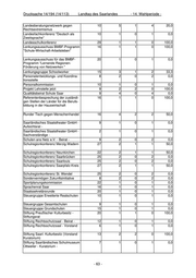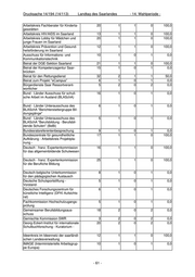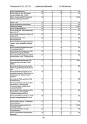 Drucksache 14/194 (14/113) Landtag des Saarlandes - 14. Wahlperiode - BLAG Fernerkundung 24 1 0 1 0,0 BLAG KliNa Ad Hoc AG Anpas- 20 1 0 1 0,0 sungsstrategien der Länder BLAI - Ausschuss LWV (Luftquali- 30 1 1 0 100,0 tät/Wirkungsfragen/Verkehr) BLAK "Life" 18 1 0 1 0,0 BLFA Straßenpersonenverkehr 17 1 0 1 0,0 Brandschutzbeirat 20 1 1 0 100,0 Bund Ländertreffen FÖJ 20 1 0 1 0,0 Bund-Länder AK "Berichtspflichten 41 1 0 1 0,0 nach IVU-Ri" Bund-Länder Austausch Klima und 20 1 0 1 0,0 Anpassung Bund-Länder-AK FFH- 30 1 0 1 0,0 Berichtspflichten Bund-Länder-Arbeitsgemeinschaft 17 1 0 1 0,0 "KliNA - Klima, Mobilität, Nachhal- tigkeit Bund-Länder-Arbeitsgemeinschaft 17 1 0 1 0,0 "Umweltgesetzbuch" Bund-Länder-Arbeitsgemeinschaft 22 1 0 1 0,0 Bodenforschung (BLA-GEO) Bund-Länder-Arbeitsgruppe Öffent- 21 1 0 1 0,0 lichkeitsarbeit in der Forstwirtschaft Bund-Länder-Arbeitsgruppe „Bo- 17 2 1 1 50,0 denzustandserhebung im Wald (BZE)“ Bund-Länder-Fachausschuss Be- 21 1 0 1 0,0 förderung gefährlicher Güter BLFA- GG Bund-Länder-Fachausschuss für 19 1 0 1 0,0 Angelegenheitender Zulassung von Fahrzeugen im Straßenverkehr BLFA-Fz Bund-Länder-Fachausschuss Gü- 17 1 0 1 0,0 terkraftverkehr Bund-Länder-Fachausschuss Stra- 46 1 0 1 0,0 ßenverkehrs-Ordnung/OWI- Themenschwerp. Verkehrsord- nungswidrigkeiten Bund-Länder-Fachausschuss Stra- 62 1 0 1 0,0 ßenverkehrs-Ordnung/OWI- Themenschwerpunkt StVO Bund-Länder-Fachausschuss Tech- 26 1 0 1 0,0 nisches Kraftfahrwesen BLFA-TK Bund-Länder-Tagung Trinkwasser- 18 1 0 1 0,0 notversorgung Bund-Länderausschuss Schorn- 17 1 1 0 100,0 steinfegerwesen Bund-Ländertreffen der Öko- 20 1 0 1 0,0 Auditreferenten Bund-Ländertreffen Umweltverein- 20 1 0 1 0,0 barungen - 68 -