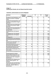 Drucksache 14/194 (14/113) Landtag des Saarlandes - 14. Wahlperiode - Anlage 10 Auflistung der Gremien, die vom Ressort beschickt werden ordentliche, stellvertretende und externe Mitglieder Gremium Mitglieder W M Frauen gesamt entsendet in % Ärztegericht des Saarlandes in der 9 3 0 3 0,0 Besetzung ärztlicher Angelegen- heiten Ärztegericht des Saarlandes in der 9 3 0 3 0,0 Besetzung zahnärztlicher Angele- genheiten Ärztegerichtshof des Saarlandes in 15 6 2 4 33,3 der Besetzung ärztlicher Angele- genheiten Ärztegerichtshof des Saarlandes in 15 6 2 4 33,3 der Besetzung zahnärztlicher An- gelegenheiten Anstaltsbeirat der JVA Neunkir- 6 5 2 3 40,0 chen Anstaltsbeirat der JVA Ottweiler 5 5 2 3 40,0 Anstaltsbeirat der JVA Saarbrü- 7 5 2 3 40,0 cken Anwaltsgericht 9 9 4 5 44,4 Apothekergericht des Saarlandes 9 3 1 2 33,3 Apothekergerichtshof des Saarlan- 15 6 3 3 50,0 des Ausschuss für Informations- und 10 1 0 1 0,0 Kommunikationstechnik Berufsbildungsausschuss bei der 36 36 15 21 41,7 RA-Kammer des Saarlandes Berufsbildungsausschuss bei der 36 36 11 25 30,6 Saarländischen Notarkammer Bund-Länder-Arbeitsgruppe Häus- 33 1 1 0 100,0 liche Gewalt Bundesratsreferentenbesprechung 9 1 1 0 100,0 Disziplinargericht für Notare 4 4 1 3 25,0 Ehrenamtliche Richterinnen und 15 10 2 8 20,0 Richter für die Kammern für Han- delssachen bei dem Landgericht Saarbrücken Europäische EDV-Akademie des 8 1 0 1 0,0 Rechts (EEAR) gGmbH - Auf- sichtsrat Fachkammer des Verwaltungsge- 20 20 6 14 30,0 richts des Saarlandes gem. § 114 SPersVG - Vorschl. Stelle: Ge- werkschaften - 88 -