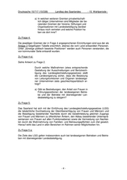 Drucksache 15/717 (15/338) Landtag des Saarlandes - 15. Wahlperiode - a) In welchen weiteren Gremien privatwirtschaft- lich tätiger Unternehmen sind Mitglieder der be- ratenden Gremien der Vereine, Stiftungen und Organisationen mit Landesbeteiligung darüber hinaus noch vertreten und welche Position ha- ben sie dort inne? Zu Frage 4: Die jeweiligen Gremien der in Frage 4 angesprochenen Einrichtungen sind aus der als Anlage 3 beigefügten Tabelle ersichtlich, ebenso die vom Land entsandten Personen. Unter „sonstige politisch besetzte Positionen“ werden auch Personen verstanden, die von kommunaler Seite entsandt wurden. Zu Frage 4 a): Siehe Antwort zu Frage 2. Durch welche Maßnahmen (etwa entsprechende Gestaltung der Ausschreibungen und Berücksich- tigung des Landesgleichstellungsgesetzes) stellt die Landesregierung sicher, dass die Besetzung von Leitungsfunktionen und Organen landeseige- ner Unternehmen stets geschlechtsparitätisch er- folgt? a) Gibt es Bestrebungen, den Anteil von Frauen in Führungspositionen der landeseigenen Betrie- be und der Betriebe mit überwiegender Lan- desbeteiligung zu steigern? Zu Frage 5: Das Saarland hat sich mit der Einführung des Landesgleichstellungsgesetzes (LGG) die tatsächliche Durchsetzung der Gleichberechtigung von Frauen und Männern und die Beseitigung bestehender Nachteile durch die Gewährleistung gleichen Zugangs von Frauen und Männern zu öffentlichen Ämtern, den Abbau bestehender Unterreprä- sentanzen von Frauen auf allen Funktionsebenen sowie die Vermeidung von Nachtei- len durch die Wahrnehmung von Familien- und Betreuungspflichten zum Ziel gesetzt. Hierauf wirkt das Land in allen Bereichen im Rahmen seiner Möglichkeiten hin. Zu Frage 5 a: Die Ziele des LGG gelten insbesondere auch bei landeseigenen Betrieben und Betrie- ben mit überwiegender Landesbeteiligung. -4-