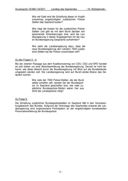 Drucksache 16/368 (16/307) Landtag des Saarlandes - 16. Wahlperiode - Wie viel Geld wird die Schaffung dieser im Koaliti- onsvertrag angekündigten zusätzlichen Polizei- Stellen das Saarland kosten? Wer trägt die Kosten für die zusätzlichen Polizei- Stellen und gibt es mit dem Bund darüber ent- sprechende Vereinbarungen bzw. wird die Lan- desregierung in dieser Angelegenheit mit der neu- en Bundesregierung Gespräche aufnehmen? Wie steht die Landesregierung dazu, dass die neue Bundesregierung den Ländern 7500 zusätz- liche Stellen bei der Polizei vorschreiben will? Zu den Fragen 2 - 4: Bei der zitierten Passage aus dem Koalitionsvertrag von CDU, CSU und SPD handelt es sich bisher um eine Absichtserklärung der Bundesregierung. Derzeit ist nicht be- kannt, wie diese Absicht durch die Bundesregierung mit Blick auf die Bundesländer umgesetzt werden soll. Die Landesregierung wird auf Bund-Länder-Ebene das Ge- spräch suchen. Wie viele der 7500 Polizei-Stellen, die der Bund selbst schaffen will, werden bei der Bundespoli- zei im Saarland geschaffen bzw. wie viele zu- sätzliche Bundespolizei-Stellen wären hier aus Sicht der Landespolizei nötig? Zu Frage 5: Die Schaffung zusätzlicher Bundespolizeistellen im Saarland fällt in den Verantwor- tungsbereich des Bundes. Aufgrund der Grenzlage des Saarlandes erwartet die Lan- desregierung eine angemessene Partizipation an der angekündigten bundesweiten Personalverstärkung der Bundespolizei. -2-