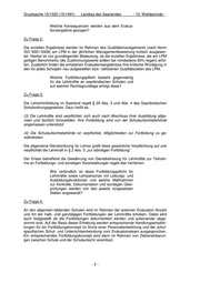 Drucksache 15/1520 (15/1491) Landtag des Saarlandes - 15. Wahlperiode - Welche Konsequenzen werden aus dem Evalua- tionsergebnis gezogen? Zu Frage 2: Die erzielten Ergebnisse werden im Rahmen des Qualitätsmanagements (nach Norm ISO 9001-2008) am LPM in der jährlichen Managementbewertung kritisch ausgewer- tet. Hierbei ist von grundlegender Bedeutung, ob die erzielten Ergebnisse, die am LPM gültigen Benchmarks (die Zustimmungswerte sollten bei mindestens 80% liegen) erfül- len. Zusätzlich finden die erhobenen Evaluationsergebnisse ihre kritische Würdigung in den für jedes Schuljahr neu aufgestellten bzw. ratifizierten Qualitätszielen des LPM. Welche Fortbildungspflicht besteht gegenwärtig für die Lehrkräfte an saarländischen Schulen und auf welcher Rechtsgrundlage erfolgt diese? Zu Frage 3: Die Lehrerfortbildung im Saarland regelt § 29 Abs. 3 und Abs. 4 des Saarländischen Schulordnungsgesetzes. Dazu heißt es: (3) Die Lehrkräfte sind verpflichtet, sich auch nach Abschluss ihrer Ausbildung allge- mein und fachlich fortzubilden. Ihre Fortbildung wird von der Schulaufsichtsbehörde angemessen unterstützt. (4) Die Schulaufsichtsbehörde ist verpflichtet, Möglichkeiten zur Fortbildung zu ge- währleisten. Die allgemeine Dienstordnung für Lehrer greift diese gesetzliche Verpflichtung auf und verpflichtet die Lehrkraft in § 2 Abs. 5 „zur ständigen Fortbildung“. Der Erlass betreffend die Gewährung von Dienstbefreiung für Lehrkräfte zur Teilnah- me an Fortbildungs- und sonstigen Veranstaltungen regelt das Verfahren. Wie verbindlich ist diese Fortbildungspflicht für Lehrkräfte sowie Lehrpersonen mit Leitungs- und Ausbildungsfunktionen und welche Maßnahmen zur Kontrolle, Dokumentation und sonstigen Über- prüfungen werden von den jeweils vorgesetzten Stellen angewandt? Zu Frage 4: An den allgemein bildenden Schulen wird im Rahmen der externen Evaluation Anzahl und Art der halb- und ganztägigen Fortbildungen der Lehrkräfte erhoben. Dabei wird auch festgestellt ob die Fortbildungen dokumentiert werden und aufeinander abge- stimmt sind. Auf der Basis dieser Erhebung werden entsprechende Handlungsempfeh- lungen für ein Fortbildungskonzept im Sinne einer Personalentwicklung und der schul- spezifischen Schul- und Unterrichtsentwicklung vom Evaluationsteam ausgesprochen. Ein entsprechendes Fortbildungskonzept wird dann im Rahmen von Zielvereinbarun- gen zwischen Schule und der Schulaufsicht vereinbart. -2-
