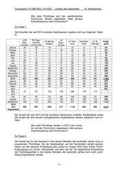 Drucksache 15/1589-NEU (15/1522) Landtag des Saarlandes - 15. Wahlperiode - Nach dem System zur Erstverteilung der Asylbewerber auf die Erstaufnahmeeinrich- tungen in den Bundesländern (dem sog. „EASY-System“) hat das Saarland bis zum 8. Oktober 2015 um 07:49 Uhr bereits 7.664 Flüchtlinge als Asylbewerber aufgenom- men. Bei einem bundesweiten Zugang 2015 in Höhe von insgesamt 800.000 Flüchtlin- gen müsste das Saarland nach dem Königsteiner Schlüssel (1,21566%) in diesem Jahr insgesamt 9.725 Asylbewerber, d. h. bis zum Jahresende noch weitere 2.061 Asylbewerber aufnehmen. Die Zugangszahlen der letzten Wochen lassen allerdings einen höheren Zugang erwarten. Die Verteilung der Asylbewerber auf die Landeshauptstadt Saarbrücken, den Regio- nalverband Saarbrücken und die Landkreise erfolgt nach folgendem Verteilschlüssel: Landeshaupt- Regionalverband Landkreis Landkreis Landkreis Saarpfalz- Landkreis stadt Saarbrücken Merzig- Neunkirchen Saarlouis Kreis St. Wendel Saarbrücken (ohne LHS) Wadern 8,28% 12,41% 13,04% 13,03% 23,35% 18,33% 11,58% Das Land unterstützt die Gemeinden bei der Bewältigung der Aufgabe der Unterbrin- gung der Asylbewerber durch die Einrichtung neuer landeseigener Unterbringungsein- richtungen (konkret in Planung und in der Umsetzung am Standort der RAG in Hirsch- bach) und durch das finanziell erheblich aufgestockte Flüchtlingswohnraumprogramm des Landes (vgl. Antwort zu Frage 11). Über wie viele eigene Wohnungen verfügen die einzelnen Kommunen mit welcher Aufnahmeka- pazität? Zu Frage 3: Die Wohnungsbestände der einzelnen Gemeinden sind der Landesregierung nicht be- kannt und könnten nur durch eine Umfrage ermittelt werden. Die Gemeinden schulden der Regierung jedoch nicht ohne besonderen Grund Rechenschaft über Anzahl und Größe der in ihrem Eigentum stehenden Wohnungen. Ob eine Gemeinde Daseinsvor- sorge durch die Bereitstellung von Mietwohnungen betreiben will, entscheidet sie im Rahmen der kommunalen Selbstverwaltung. In Selbstverwaltungsangelegenheiten kommt dem Land nur eine Rechtsaufsicht gegenüber den Kommunen zu, die ein Aus- kunftsrecht einschließt. Dieses dient wie die Kommunalaufsicht insgesamt der Gewähr- leistung rechtmäßiger Zustände. Da mögliche Rechtsverstöße nicht in Rede stehen, be- steht für die Gemeinden keine Pflicht zur Auskunft über die gestellte Frage. Gibt es derzeit Leerstände in kommunalem Eigen- tum (auch Hallen, ehemalige Schul- oder Verwal- tungsgebäude etc.) bzw. bei institutionellen Anbie- tern wie kommunalen Wohnungsbaugesellschaf- ten? Wenn ja, in welchen Kommunen und wie vie- le und welche Objekte sind betroffen? Zu Frage 4: Die Landesregierung verfügt nicht über ein Register der Leerstände in Gebäuden der Kommunen oder kommunaler Gesellschaften. Auch die Verwaltung ihres Vermögens gehört grundsätzlich zu dem verfassungsrechtlich geschützten eigenen Wirkungskreis der Kommunen, in dem sie nur der hier nicht berührten Rechtsaufsicht unterliegen. Kommunale Gesellschaften sind als Subjekte des Privatrechts der Kommunalaufsicht nicht unterworfen. Insgesamt ist daher eine Umfrage zur Beantwortung der Frage 4 ebenfalls nicht veranlasst. -3-
