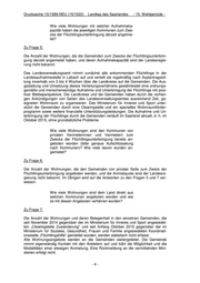 Drucksache 15/1589-NEU (15/1522) Landtag des Saarlandes - 15. Wahlperiode - Betreiben die Kommunen aktiv Werbung für die Vermietung privater Flächen zur Unterbringung von Flüchtlingen? Zu Frage 8: Beispiele von kommunalen Aufrufen an die Einwohner, Wohnungen für Flüchtlinge zur Verfügung zu stellen, sind der Landesregierung bekannt. Über eine entsprechende Gesamtübersicht verfügt sie nicht. Beabsichtigt die Landesregierung aktiv für die pri- vate Unterbringung von Flüchtlingen zu werben und wie gestaltet sich die diesbezügliche Zusam- menarbeit mit den Kommunen konkret? Zu Frage 9: Der Minister für Inneres und Sport wirbt seit Monaten aktiv bei den Gemeinden und den Gemeindeverbänden sowie in den Medien für eine Verstärkung der Bemühungen um eine geordnete Aufnahme und Unterbringung der schutzbedürftigen Flüchtlinge. Über die kommunalen Spitzenverbände werden die Kommunen auch zukünftig ver- stärkt auf die Notwendigkeit der Schaffung von weiterem Wohnraum sowie die dazu notwendigen Planungen und Umsetzungsschritte hingewiesen werden. Die Fortset- zung und Aufstockung des Flüchtlingswohnraumprogramms des Landes ist ein erklär- tes Ziel. Sind private Flächenangebote trotz Bedarfes von Kommunen abgelehnt worden? Wenn ja, von wel- chen Kommunen und mit welcher Begründung? Zu Frage 10: Etliche private Anbieter haben sich bei Regierungsstellen darüber beklagt, dass die Gemeinde ihr Immobilienangebot nicht annehme. Teilweise wurde dabei auch die Be- gründung wie beispielsweise die Bevorzugung des Wohnungsbestandes einer kom- munalen Gesellschaft berichtet. Denkbare weitere Gründe sind etwa die mangelnde Eignung oder die Unwirtschaftlichkeit eines Angebots. Die zur vollständigen Beantwor- tung der Frage nötige Aufklärung aller einschlägigen Sachverhalte bei den Kommunen wäre sehr arbeitsaufwändig und nicht mit einer Aufsichtsfunktion des Landes zu recht- fertigen. Welche Zuschüsse des Landes zur Schaffung von Wohnraum für Flüchtlinge haben die Kommunen in welcher Höhe bereits in Anspruch genommen? In welcher Höhe sind Förderanträge an das Land gestellt worden (bitte genaue Aufschlüsselung nach Kommunen)? -5-