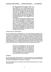 Drucksache 15/2069 (15/2040) Landtag des Saarlandes - 15. Wahlperiode - Die Globus SB-Warenhaus Holding GmbH & Co. KG beabsichtigt die Errichtung eines SB- Warenhauses auf dem LIK.Nord-Gebiet Betzen- hölle in Neunkirchen. Die Fläche von mehr als fünf Hektar liegt im Kerngebiet des Naturschutzgroß- vorhabens, das insgesamt 2.500 Hektar umfasst. Auf ihr soll eine Verkaufsfläche von 11.000 Quad- ratmetern entstehen. Bei der Abstimmung durch den Zweckverband befürworteten 19 Mitglieder ein Raumordnungsverfahren, neun Mitglieder stimm- ten dagegen. Um ein Raumordnungsverfahren schließlich einlei- ten zu können, muss jedoch zunächst eine Erklä- rung durch das Bundesamt für Naturschutz und durch das Bundesministerium für Umwelt, Natur- schutz, Bau und Reaktorsicherheit abgegeben werden, ob ihrerseits der Einleitung eines Raum- ordnungsverfahrens zugestimmt werden kann und unter welchen Bedingungen bei einer raumordne- risch ermittelten Zulässigkeit des Vorhabens einer Entlassung der betroffenen Grundfläche aus dem Kerngebiet zugestimmt wird.“ Vorbemerkung der Landesregierung: Der unter Bezugnahme auf Medienberichte in der Vorbemerkung dargestellte Sach- verhalt, die Kommunalaufsicht habe die Zustimmung der Verbandsversammlung der „Landschaft der Industriekultur“ (kurz LIK.Nord) zur Einleitung eines Raumordnungs- verfahrens als rechtswidrig bezeichnet, ist insoweit zutreffend, als festgestellt wurde, dass der erste Beschluss an einem formellen Mangel litt. Der Beschluss war unter Ver- stoß gegen § 13a Absatz 2 des Gesetzes über die kommunale Gemeinschaftsarbeit zustande gekommen. Zum inhaltlichen Gegenstand des Beschlusses äußerte sich die Kommunalaufsicht nicht. Der Zweckverband LIK.Nord hat am 22.12.16 erneut per Be- schluss seine Zustimmung zur Einleitung eines Raumordnungsverfahrens erteilt. Wie geht die Landesregierung mit der Prüfung durch die Kommunalaufsicht um? Wie beurteilt sie in diesem Zusammenhang die gar nicht erst be- handelte Problemstellung, ob die Verbandsver- sammlung LIK.Nord überhaupt im Rahmen ihrer Satzung und der landes- und kommunalrechtli- chen Zuständigkeiten der Einleitung eines Raum- ordnungsverfahrens zustimmen kann? Zu Frage 1: Bei der gegenwärtigen Beschlusslage im LIK.Nord bestand für die Landesregierung bislang keine Notwendigkeit, sich mit der nicht behandelten Problemstellung außerhalb der kommunalaufsichtlichen Prüfung weiter zu befassen. Generell entscheidet über die Einleitung eines Raumordnungsverfahrens die Landes- planungsbehörde. -2-