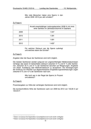 Drucksache 15/405 (15/314) Landtag des Saarlandes - 15. Wahlperiode - Wie viele Menschen haben eine Sperre in den Jahren 2009 -2012 pro Jahr erhalten? Zu Frage 4: Anzahl erwerbsfähiger Leistungsbezieher (SGB II) mit mind. einer Sanktion im Jahresdurchschnitt im Saarland 2009 1.547 2010 1.591 2011 1.691 1 2012 1.425 Für welchen Zeitraum war die Sperre auferlegt und welches waren die Gründe? Zu Frage 5: Angaben über die Dauer der Sanktionen sind nicht möglich. Die meisten Sanktionen werden aufgrund von ungerechtfertigten Meldeversäumnissen verhängt, das waren im betrachteten Zeitraum zwischen 51 % und 61 % aller Sanktio- nen. Zwischen 25 % und 31 % der Sanktionen beruhten auf Weigerungen, Angebote von Arbeit, Ausbildung oder Maßnahmebesuch zu akzeptieren. Die Verweigerungen der Erfüllung von Pflichten aus abgeschlossenen Eingliederungsvereinbarungen zogen zwischen 8 % und 12 % der Sanktionen nach sich. Wie hoch war in der Regel die Sperre (in Prozent und absolut)? Zu Frage 6: Prozentangaben zur Höhe der verhängten Sanktionen sind nicht möglich. Die durchschnittliche Höhe der Sanktionen sank von 2009 bis 2012 von 142,65 € auf 2 120,03 € . 1 Daten von Januar bis September; Gesamtjahreswert noch nicht verfügbar 2 Daten von Januar bis September; Gesamtjahreswert noch nicht verfügbar -5-
