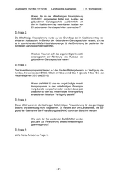 Drucksache 15/1066 (15/1018) Landtag des Saarlandes - 15. Wahlperiode - Dient dieses Investitionsprogramm dem Ziel, 25 gebundene Ganztagsschulen einzurichten, oder wird es aufgrund dieses Investitionspro- gramms möglich sein, mehr als 25 gebundene Ganztagsschulen zu realisieren? Zu Frage 6: Schulträger, die in ihrem Verantwortungsbereich eine Schule in eine Gebundene Ganztagsschule umwandeln, Ganztagsklassen einrichten oder zusätzliche Plätze für die Freiwillige Ganztagsschule schaffen wollen, stellen hierfür die erforderlichen Räum- lichkeiten bereit. Mit dem Investitionsprogramm sollen die Schulträger bzgl. der im Zu- sammenhang mit diesen Maßnahmen entstehenden Bauinvestitionen entlastet wer- den. Das Investitionsprogramm dient damit der weiteren Entlastung der Schulträger beim Ausbau ihres Ganztagsschulangebotes. Die mittelfristige Finanzplanung der Landesregierung basiert weiterhin auf dem im Koalitionsvertrag vereinbarten Ausbau- ziel. (s. Antwort zu Frage 2). Wenn das Investitionsprogramm lediglich dem Ziel dient, 25 gebundene Ganztagsschulen einzurich- ten: Trifft es also zu, dass das Land Maßnahmen, die es laut Koalitionsvertrag vereinbart und einge- plant hatte, nun (teilweise) durch freiwerdende Ba- föG-Mittel finanziert und die BaföG-Mittel damit nicht dazu nutzt, zusätzliche Maßnahmen im Be- reich von Bildung und Hochschule zu finanzieren? Wenn ja: Sieht die Landesregierung dies durch die am 26. Mai 2014 geschlossene Vereinbarung von Bund und Ländern über die Verwendung der frei- werdenden BaföG-Mittel des Landes gedeckt? Zu Frage 7: Zur Erreichung des im Koalitionsvertrag beschriebenen Ausbauziels wurde mit der Einrichtung des Titels 68402 ausreichend Haushaltsvorsorge getroffen (siehe Beant- wortungen der Fragen 1 und 2). Mit Landesmitteln, die aufgrund der Übernahme der Finanzierung des BAföG (für Schüler und Studierende) durch den Bund frei werden, sollen die Schulträger in der Funktion als Sachkostenträger der Schulen unterstützt werden (siehe Beantwortung von Frage 6). Die vorgesehene Verwendung entspricht der am 26. Mai 2014 abgeschlossenen Vereinbarung von Bund und Ländern bzgl. der Finanzierung der im Koalitionsvertrag vorgesehenen prioritären Maßnahmen im Bil- dungsbereich, da die frei werdenden Mittel zur Finanzierung von Bildungsausgaben verwendet werden. -3-