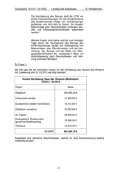 Drucksache 15/1411 (15/1300) Landtag des Saarlandes - 15. Wahlperiode - Die Verzögerung des Bezugs stellt die HTW vor große Herausforderungen für die Gewährleistung des Studienbetriebs infolge von Unterbringungs- problemen und führt dort zu Kosten. So mussten Mietverträge alter Räumlichkeiten verlängert wer- den und Übergangsräumlichkeiten angemietet werden.“ Welche Kosten sind bisher und bis zum heutigen Tage durch die Verzögerung des Bezugs des HTW-Hochhauses infolge der Verlängerung von Mietverträgen alter Räumlichkeiten und der Her- richtung, des Bezugs und der Miete von Über- gangsräumlichkeiten etc. entstanden? (Bitte um Aufschlüsselung nach Räumlichkeiten und Nen- nung konkreter Beträge!) Zu Frage 1: Die htw saar hat die bisherigen Kosten für den Nichtbezug des Hauses des Wissens mit Zulieferung vom 31.03.2015 wie folgt beziffert: Kosten Nichtbezug Haus des Wissens (Mietkosten) 10/2013 - 03/2015 Objekt Miete Rastpfuhl 509.684,00 € Hohenzollernstraße 31.402,08 € Eurobahnhof (Atelier Architekten) 19.737,84 € Göttelborn (Aviation) 25.352,09 € St. Ingbert 69.300,00 € Evangelische Studierenden- 10.000,00 € gemeinde/Waldhausweg Totohaus 18.219,75 € GESAMT 683.695,76 € Aufgelistet sind sämtliche Räumlichkeiten, welche für eine Interimsnutzung bislang notwendig wurden. -2-