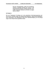 Drucksache 16/373 (16/323) Landtag des Saarlandes - 16. Wahlperiode - Sind die Tatverdächtigen, gegen die Ermittlungs- verfahren eingeleitet worden sind, bereits in der Vergangenheit polizeilich auffällig geworden (Vor- strafen, laufende Verfahren) und wenn ja, wegen welcher Delikte? Zu Fragen 5: Der zum Tatzeitpunkt 18-Jährige ist in den polizeilichen Informationssystemen auf- grund eines Verstoßes gegen das Betäubungsmittelgesetz, Köperverletzungsdelikten, einer Raubstraftat, einer Beleidigung sowie einer Sachbeschädigung, der 23-Jährige wegen eines Körperverletzungsdelikts erfasst. -3-