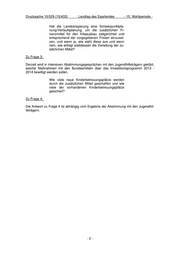 LANDTAG DES SAARLANDES 15. Wahlperiode Drucksache 15/529 (15/433) 17.06.2013 ANTWORT zu der Anfrage der Abgeordneten Barbara Spaniol (DIE LINKE.) betr.: Kitaausbau Vorbemerkung der Landesregierung: Das Gesetz zur zusätzlichen Förderung von Kindern unter drei Jahren in Tageseinrich- tungen und in Kindertagespflege beinhaltet eine Aufstockung des Sondervermögens für den Kitaausbau durch den Bund um 580 Mio. € mit Laufzeit 2013/2014 mit dem Ziel, 30.000 zusätzliche Betreuungsplätze für Kinder U3 zu schaffen. Bei der Mittelver- gabe setzt das Gesetz sehr enge Fristen. So müssen die Länder bis zum 30.06.2013 nachweisen, dass 50 Prozent der zusätzlichen Mittel bewilligt sind. Ist dies nicht der Fall, werden die bis dahin nicht bewilligten Mittel verfallen und an die Länder weiterver- teilt, die ihr Bewilligungskontingent ausschöpfen konnten. Kann die Landesregierung sicherstellen, dass 50 Prozent der zusätzlichen Bundesmittel für den Kitaausbau 2013/2014 wie von der Bundesregie- rung verlangt bis zum 30.06.2013 bewilligt sind, und wenn ja, wie und wenn nein, warum nicht? Zu Frage 1: Ja. Das Gesetz zur zusätzlichen Förderung von Kindern unter drei Jahren in Kinderta- geseinrichtungen und in Kindertagespflege sieht vor, dass die mit dem Investitionspro- gramm „Kinderbetreuungsfinanzierung“ 2013-2014 bereitgestellten Bundesmittel für Investitionsvorhaben zur Schaffung von zusätzlichen Betreuungsplätzen eingesetzt werden können, die ab dem 1. Juli 2012 begonnen wurden. Das Land stellt die Kofi- nanzierung sicher. Kann die Landesregierung die entsprechend not- wendige Co-Finanzierung bis 30.06.2013 sicher- stellen und wenn ja, wie und wenn nein, warum nicht? Zu Frage 2: Ja, da die zu Frage 1 aufgeführten Maßnahmen zur Schaffung von zusätzlichen Be- treuungsplätzen bisher ausschließlich mit Landesmitteln vorfinanziert wurden. Ausgegeben: 17.06.2013 (18.04.2013) bitte wenden