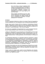 Drucksache 15/450 (15/343) Landtag des Saarlandes - 15. Wahlperiode - Die in der Antwort zu Frage 2 aufgeführten Maß- nahmen der Landesregierung zur frühzeitigen in- dividuellen Förderung der Schülerinnen und Schü- ler sind allesamt Maßnahmen, die von der Vor- gängerregierung erfolgreich eingeleitet bzw. durchgeführt worden sind. Daraus ergibt sich fol- gende Nachfrage: Gibt es darüber hinausgehend neue bzw. weiter- gehende Maßnahmen zur individuellen Förderung und zur Vermeidung des weiteren Anstiegs der Zahl von Schülerinnen und Schülern mit sonder- pädagogischem Förderbedarf? Zu Frage 2: Die bisher eingeleiteten Maßnahmen erfahren in der jetzigen Phase ihre Ausgestaltung und eine umfassende und in die landesweite Praxis umzusetzende Weiterentwicklung. Darüber hinaus wurde im Sommer 2012 ein Konzept zur Fortentwicklung inklusiver Aspekte in Regelschulen erstmals erstellt und auf den Weg gebracht. Dieses Konzept liegt nun für den Primarbereich vor, befindet sich zurzeit in der Abstimmungsphase und wird danach - wie oben beschrieben - nach und nach umgesetzt. Der Einsatz der ausgebildeten Inklusionsberater/innen wurde konzeptionell überarbei- tet und in Zusammenarbeit mit dem LPM auf eine neue Grundlage gestellt. „Umgang mit Heterogenität“ war vom Konzept der Lehrerausbildung für den neuen Studiengang Grundschule als Wahlpflichtfach geplant. Inzwischen gibt es in der Leh- rerbildung (erste, zweite und dritte Phase) eine enge Zusammenarbeit zwischen Uni- versität, Studienseminaren, Fortbildungsinstituten und dem Ministerium für Bildung und Kultur. Um weitergehende Maßnahmen zur individuellen Förderung verwirklichen zu können und eine Vermeidung des weiteren Anstiegs der Zahl von Schülerinnen und Schülern mit sonderpädagogischem Förderbedarf zu erreichen, ist das noch bestehende Verfah- ren zur Anerkennung sonderpädagogischen Förderbedarfs zu optimieren. Steigt bei zurückgehenden Schülerzahlen weiterhin die Zahl der Schülerinnen und Schüler mit anerkanntem sonderpädagogischen Förderbedarf, sinken auch die Ressourcen an Lehrerwochenstunden für Maßnahmen zur individuellen Förderung. Aus diesem Grund werden auch schon bei Antragstellung auf Überprüfung auf sonder- pädagogischen Förderbedarf nicht alle Anträge von den Förderzentren und dem Minis- terium für Bildung und Kultur gerade im Sinne der Schülerinnen und Schüler zur Gu- tachtenerstellung weitergeleitet. Vielmehr werden die Anträge genau geprüft und bei Nichterteilung des Gutachte- nauftrags die Antragssteller in Bezug auf die individuelle Hilfe für den Schüler/die Schülerin in der Regelschule beraten. -2-