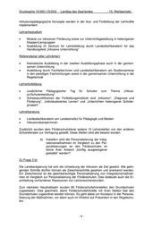 Drucksache 15/450 (15/343) Landtag des Saarlandes - 15. Wahlperiode - Inklusionspädagogische Konzepte werden in der Aus- und Fortbildung der Lehrkräfte implementiert: Lehramtsstudium • Module zur inklusiven Förderung sowie zur Unterrichtsgestaltung in heterogenen Klassen/Lerngruppen • Ausbildung im Zentrum für Lehrerbildung durch Landesfachberaterin für das Handlungsfeld „Inklusive Unterrichtung“ Referendariat (aller Lehrämter) • thematische Ausbildung in der zweiten Ausbildungsphase auch in der gemein- samen Unterrichtung • Ausbildung durch Fachleiter/innen und Landesfachberaterin am Studienseminar in den jeweiligen Fachrichtungen sowie in der gemeinsamen Unterrichtung in der Regelschule Lehrerfortbildung • zusätzlicher Pädagogischer Tag für Schulen zum Thema „Inklusi- on/Schulentwicklung“ • Schwerpunktthemen der Fortbildungsinstitute sind „Inklusion“, „Diagnose und Förderung“, „Individualisiertes Lernen“ und „Unterrichten heterogener Schüler- gruppen“ Lehrerberatung • Landesfachberaterin am Landesinstitut für Pädagogik und Medien • Inklusionsberater/innen Zusätzlich wurden dem Förderschulreferat weitere 10 Lehrerstellen von den anderen Schulreferaten zur Verfügung gestellt. Diese Stellen sind alle besetzt worden. b) Inwiefern wird die Personalisierung der Integ- rationsmaßnahmen im Vergleich zu den Per- sonalisierungen an den Förderschulen im Sinne Ihrer Antwort „künftig ausgewogener gestaltet“ werden? Zu Frage 3 b): Die Landesregierung hat sich die Umsetzung der Inklusion als Ziel gesetzt. Alle gelin- genden Schritte dorthin können als Zwischenschritte gesehen und anerkannt werden. Ein Zwischenziel ist die gleichberechtigte Personalisierung von Integrationsmaßnah- men im Vergleich zur Personalisierung der Förderschulen. Dies bedeutet auch die Er- schließung vorhandener Ressourcen von Lehrerwochenstunden. Zum nächsten Haushaltsjahr wurden 80 Förderschullehrerstellen den Grundschulen zugewiesen. Dies geschieht, damit Förderschullehrkräfte mit ihren Stellen fest den Grundschulen zugeordnet werden können. Es geht dabei um Konstanz in der Persona- lisierung der Maßnahmen, vor allem auch im Hinblick auf Prävention in den Regelschu- len. -4-