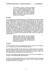 Drucksache 15/450 (15/343) Landtag des Saarlandes - 15. Wahlperiode - In der Antwort zu Frage 10 nehmen sie Abstand von der im Koalitionsvertrag vereinbarten Rege- lung, den Einsatz der Integrationshelfer im Schul- bereich zukünftig ins Bildungsministerium zu ver- lagern. Daraus ergibt sich folgende Nachfrage: Welche Gründe führten dazu, dies im Koalitions- vertrag zu vereinbaren und warum wird diese Ver- einbarung nicht umgesetzt? Zu Frage 6: Die Finanzierung der Integrationshelferinnen und Integrationshelfer erfolgt aus Mitteln der Eingliederungshilfe nach dem Sozialgesetzbuch (SGB). Die vom Land zu erbrin- genden Sozialleistungen, unter die auch die Eingliederungshilfe fällt, sind haushalts- mäßig in einem Titel mit entsprechend hohem Haushaltsansatz beim Landesamt für Soziales veranschlagt. Innerhalb dieses Titels können bedarfsgerechte Verschiebun- gen im Rahmen der unterschiedlichen SGB-Leistungen vorgenommen werden. Durch die Ausgliederung eines im Verhältnis zum Gesamtvolumen der Sozialleistungen eher geringen Haushaltsansatzes für die Integrationshelfer/innen wäre diese Flexibilität im Einsatz der Mittel verloren gegangen. Die Koalitionspartner haben sich daher darauf verständigt, den Haushaltsansatz beim Ministerium für Soziales, Gesundheit, Familie und Frauen zu belassen und die inhaltliche Ausgestaltung des Einsatzes der Integrati- onshelferinnen und Integrationshelfer in enger Kooperation zu realisieren. Die Verant- wortung für den schulischen Bereich liegt damit beim MBK, so wie es im Koalitionsver- trag festgelegt ist. Weder der „Beirat Inklusion“ noch die „Lenkungs- gruppe Inklusion“ haben seit der Regierungsüber- nahme durch die große Koalition getagt. Existieren beide Gremien noch und wann ist beabsichtigt mit welchem Ziel eines dieser Gremien oder auch bei- de wieder einzuberufen? Zu Frage 7: Der „Beirat Inklusion“ und die „Lenkungsgruppe Inklusion“ wurden von der Regierung der 14. Legislaturperiode im Jahr 2010 erstmalig einberufen. Die „AG Inklusion“ des MBK hat meist gemeinsam vor beiden Gremien ihre Arbeitser- gebnisse vorgestellt. Durch die hohe Anzahl von Berufenen (über 100) in diesen Gre- mien kam es kaum zu Diskussionen und erst recht nicht zur Lenkung. In dieser Hin- sicht haben beide Gremien ihre Funktion nicht erfüllen können. Es ist nun die Aufgabe des MBK, beide Gremien von der Anzahl ihrer Mitglieder zu reduzieren, damit Arbeitsfähigkeit gewährleistet wird. Gesetzes- und Verordnungsänderungen, die im Zusammenhang mit der Umsetzung der UN-Behindertenrechtskonvention stehen, werden in einem transparenten Beteili- gungsprozess diskutiert und umgesetzt. -7-