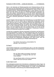 Drucksache 15/1994 (15/1943) Landtag des Saarlandes - 15. Wahlperiode - Wenn in der Gemeinde ein Plakatierungsverbot durch Polizeiverordnung nicht be- steht oder durch die Genehmigung einer Ausnahme durchbrochen werden soll, grei- fen verkehrsrechtliche Beschränkungen des Plakatierens ein. Nach § 33 Abs. 1 Stra- ßenverkehrs-Ordnung (Verkehrsbeeinträchtigungen) ist jede Werbung und Propa- ganda durch Bild, Schrift, Licht oder Ton außerhalb geschlossener Ortschaften ver- boten, wenn dadurch Verkehrsteilnehmer in einer den Verkehr gefährdenden oder erschwerenden Weise abgelenkt oder belästigt werden können, wobei die abstrakte Gefahr einer Beeinträchtigung dann genügt. Auch darf durch innerörtliche Werbung der Verkehr außerhalb geschlossener Ortschaften nicht in solcher Weise gestört werden. Innerorts hingegen sieht das Gesetz keine Einschränkung vor, da das Bedürfnis nach Werbung stark ist und der Verkehr stets mit ablenkenden Einwirkungen rechnen muss. Zwar kann auch mit einer innerörtlichen Werbung eine Gefährdung der Ver- kehrssicherheit einhergehen. Diese ist dann jedoch nach § 33 Absatz 2 StVO zu be- urteilen. Danach dürfen Einrichtungen, die Zeichen oder Verkehrseinrichtungen glei- chen, mit ihnen verwechselt werden können oder deren Wirkung beeinträchtigen können, dort nicht angebracht oder sonst verwendet werden, wo sie sich auf den Verkehr auswirken können. Werbung und Propaganda in Verbindung mit Verkehrs- zeichen und Verkehrseinrichtungen sind unzulässig. Innerhalb des so gesteckten Rahmens entscheidet die Gemeinde unter Berücksichti- gung satzungsrechtlicher Vorgaben, die nähere Bestimmungen über die Sondernut- zung treffen können, aufgrund der §§ 18, 19 SaarlStrG, 8 FStrG nach pflichtgemä- ßem Ermessen darüber, ob und mit welchen Maßgaben eine beantragte Plakatierung als Sondernutzung genehmigt wird. Dabei kann sie insbesondere bei einer Plakatie- rung außerhalb des Wahlkampfes beispielsweise auch darauf achten, dass das Ortsbild nicht durch eine Massierung von Plakaten beeinträchtigt wird. Aus welchem Grund gibt es unterschiedliche Re- gelungen in den Kommunen? Zu Frage 3: Unterschiedliche Regelungen und Handhabungen gibt es, weil jeder Ortspolizeibe- hörde und jeder Gemeinde innerhalb des gesetzlichen Rahmens ein Entscheidungs- spielraum eröffnet ist. Wie viel Fläche stellen die einzelnen Kommunen zum Plakatieren zur Verfügung? Bitte nach Kom- munen auflisten! Wie viele Plakate dürfen je Kommune aufgehängt werden? Bitte nach Kommunen auflisten! Zu den Fragen 4 und 5: Die Landesregierung besitzt keine Informationen zur Beantwortung dieser Fragen. Als straßenrechtliche Sondernutzungserlaubnis wird die Genehmigung zum Plakatieren an gemeindlichen Straßen sowie an Ortsdurchfahrten von Landes- und Bundesstraßen von den Gemeinden in Wahrnehmung ihres Selbstverwaltungsrechts erteilt. -3-