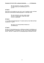 LANDTAG DES SAARLANDES 15. Wahlperiode Drucksache 15/1194 (15/1139) 18.12.2014 ANTWORT zu der Anfrage der Abgeordneten Jasmin Maurer (PIRATEN) betr.: Besetzung von A 14-Stellen im Bereich der Berufsschullehrerinnen und Berufs- schullehrer Vorbemerkung der Fragestellerin: „Im aktuellen Haushaltsentwurf für das Jahr 2015 sind 468 A 14-Stellen an Berufsschulen ausgeschrieben. Bei der Beförderung von einer A 13 auf eine A 14-Stelle besteht im Bereich des Kultusministeriums eine mehrjährige Wartezeit.“ Wie viele der 468 A 14-Stellen sind zum aktuellen Schuljahr wirklich besetzt? Zu Frage 1: Aktuell sind 446 Stellen der Besoldungsgruppe A 14 besetzt. Aus welchen Gründen wurden diese Stellen teil- weise nicht besetzt? Zu Frage 2: Es besteht immer eine Residualgröße an freien Stellen (stellvertretende Abteilungslei- tung, stellvertretende Landesfachberatung, Qualitätsmanagementbeauftragte, Beauf- tragte für Medienpädagogik, Lern-Team-Beratung, Beauftragte für Kooperation, Orga- nisation und Bildungswegeberatung), die sich durch die zeitliche Verzögerung von Ru- hestandversetzung und Wiederbesetzung ergibt. Des Weiteren führt der sukzessive Umbau der Funktionsstellenstruktur an den berufli- chen Schulen dazu, dass alte Funktionsstellen der Besoldungsgruppe A 14 (Berufs- und Fachdidaktikbetreuer), die durch Ruhestandsversetzungen frei werden, durch Funktionsstellen der neuen Funktionsstellenstruktur (Qualitätsmanagementbeauftrag- te, Lern-Team-Beratung, Beauftragte für Kooperation, Organisation und Bildungswe- geberatung) ersetzt werden. Ausgegeben: 18.12.2014 (17.11.2014)