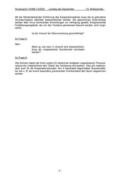 Drucksache 15/606 (15/525) Landtag des Saarlandes - 15. Wahlperiode - Mit der flächendeckenden Einführung des Kooperationsjahres muss die so gefundene Grundkonzeption allenfalls weiterentwickelt werden. Die gewonnenen Erkenntnisse werden allen hinzu kommenden Einrichtungen zur Verfügung gestellt. Entsprechende Fortbildungsangebote, die von den Tandems gemeinsam besucht werden, sind vorge- sehen. Ist der Vorwurf der Elternvertretung gerechtfertigt? Zu Frage 5: Nein. Wenn ja, wie kann in Zukunft eine Zweckentfrem- dung der vorgesehenen Stundenzahl vermieden werden? Zu Frage 6: Alle Schulen haben die ihnen explizit für bestimmte Aufgaben zugewiesenen Personal- ressourcen entsprechend dem Zweck der Zuweisung einzusetzen. Dies gilt insbeson- dere auch für die Kooperationsstunden. Nur in besonders begründeten Ausnahmefäl- len wie z. B. bei einem besonders gravierenden Krankenstand darf davon abgewichen werden. -3-