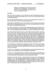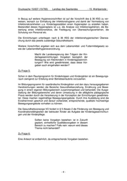 Drucksache 15/837 (15/765) Landtag des Saarlandes - 15. Wahlperiode - In Bezug auf weitere Hygienevorschriften ist auf die Vorschrift des § 36 IfSG zu ver- weisen, wonach zur Einhaltung der Infektionshygiene und damit der Vermeidung von Infektionskrankheiten u.a. Kindertagesstätten einen Hygieneplan zu erstellen haben. Bestandteil dieses Hygieneplans ist u.a. die Analyse von Infektionsgefahren, die Be- wertung eines Infektionsrisikos, die Festlegung von Überwachungsverfahren, die Schulung von Personal etc. Die Einrichtungen unterliegen nach § 36 IfSG der infektionshygienischen Überwa- chung durch das jeweils zuständige Gesundheitsamt. Weitere Vorschriften ergeben sich aus dem Lebensmittel- und Futtermittelgesetz so- wie der Lebensmittelhygieneverordnung. Macht die Landesregierung den Trägern der Kin- dertageseinrichtungen Vorgaben bezüglich der Bewegung von Kleinkindern in Kindertageseinrich- tungen? Wie wird gewährleistet, dass diese Vor- gaben auch eingehalten werden? Zu Frage 5: Schon in dem Raumprogramm für Kinderkrippen und Kindergärten ist ein Bewegungs- raum zwingend zur Erteilung einer Betriebserlaubnis vorzusehen. Im Bildungsprogramm für saarländische Kindergärten und den dazu herausgegebenen Handreichungen werden die Bereiche Gesundheitserziehung, Ernährung und Bewe- gung in einem eigenen Bildungsbereich zusammengefasst und behandelt. Die Ausge- staltung der Bildungsbereiche und deren Umsetzung in die alltägliche pädagogische Praxis werden durch die Verankerung in der Konzeption der Einrichtungen gewährleis- tet. Diese machen regelmäßige Bewegungsangebote. Durch ihre Ausbildung sind die Erzieher/innen geschult und darauf vorbereitet, entsprechende, qualitativ hochwertige Bewegungsangebote vorhalten zu können. Die Gesundheitsvorsorge-VO fordert in § 5 Absatz 2 die Förderung von Bewegung und Koordinationsfähigkeiten der betreuten Kinder als Aufgabe der Kindertageseinrichtun- gen und der Kinderpflege. Sollten keine Vorgaben bestehen: ist in Zukunft geplant, einheitliche Qualitätsvorgaben in diesem Bereich zu machen? Falls nein: warum wird dieses Thema nicht behandelt? Zu Frage 6: Eine Antwort ist entbehrlich, da entsprechende Vorgaben bestehen. -4-