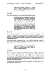 Drucksache 15/837 (15/765) Landtag des Saarlandes - 15. Wahlperiode - Sollten keine Vorgaben bestehen: ist in Zukunft geplant, einheitliche Qualitätsvorgaben in diesem Bereich zu machen? Falls nein: warum wird dieses Thema nicht behandelt? Zu Frage 2: Eine Antwort ist entbehrlich, da entsprechende Vorgaben bestehen. Wie sind die zeitlichen Anforderungen, die die Füt- terung von Kleinkindern (wie etwa die Vorberei- tung von Flaschen- oder Breinahrung, die Hilfe- stellung beim Essen, die anschließende Säube- rung des Essensplatzes und ein möglicherweise notwendig werdendes Umziehen der Kinder) in die Berechnung der Gruppengrößen und des Perso- nalschlüssels einbezogen worden? Wie soll eine ordnungsgemäße und kindgerechte Ernährung si- chergestellt werden, wenn, wie seit neuestem zu- lässig, eine Erzieherin sich um bis zu sechs Kinder kümmern muss? Zu Frage 3: Bei der Berechnung des Personalschlüssels für Kinderkrippen und altersgemischte Gruppen mit Kindern im Alter unter drei Jahren liegt der Berechnungsfaktor schon im- mer um 1/3 höher als der Berechnungsfaktor für Kindergartengruppen. Die oben aus- geführten zusätzlichen Arbeiten sind bei der Bemessung der Berechnungsfaktoren im Detail bedacht worden. Die Versorgung eines zusätzlichen Kindes in der Krippengruppe hält die Landeregie- rung, mit dem vorgegebenen Personalschlüssel für leistbar und sieht das Wohl der zu betreuenden Kinder weiterhin gewährleistet. Welche Hygienevorschriften gelten für die Ver- pflegung von Kleinkindern in Kindertageseinrich- tungen? Wie wird sichergestellt, dass diese Vor- schriften eingehalten werden? Zu Frage 4: Nach den Hygienevorschriften nach dem Infektionsschutzgesetz (IfSG) bedürfen Per- sonen, die gewerbsmäßig Tätigkeiten im Sinne des § 42 Absatz 1 IfSG erstmalig aus- üben, einer Belehrung durch das Gesundheitsamt. § 43 Absatz 4 IfSG legt weiterhin dem Arbeitgeber die Pflicht auf, diese Personen nach Aufnahme ihrer Tätigkeit und im Weiteren jährlich zu belehren. Unter den Personenkreis dieser Regelungen des IfSG sind auch die Bediensteten einer Kindertageseinrichtung zu fassen, soweit sie mit Le- bensmitteln in Berührung kommen. Die Kontrolle der Belehrungen wird durch die Bediensteten des Landesamtes für Ver- braucherschutz wahrgenommen. -3-