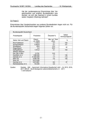 Drucksache 16/367 (16/304) Landtag des Saarlandes - 16. Wahlperiode - Hat die Landesregierung Erkenntnisse über Ver- gleichszahlen aus anderen Bundesländern bzw. darüber, wo sich das Saarland in einem bundes- weiten Vergleich (Ranking) befindet? Zu Frage 2: Erkenntnisse über Vergleichszahlen aus anderen Bundesländern liegen nicht vor. Für die Bundesrepublik Deutschland liegen folgende Zahlen vor: Bundesrepublik Deutschland Selbst- Produktsparte Produktion Ökoanteil % versorgungsgrad Fleisch Bez. auf Tiere Sektor Vieh und Fleisch % (in 1000t) (Anz) - Rind-Kalbfleisch 1.120,9 5,7 103 - Schweinefleisch 5.453,8 0,7 121 - Schaffleisch 20,6 12,3 42 - Ziegenfleisch 0,4 33,2 - Geflügelfleisch 1.514,2 4,1 103 Weitere Sektoren - Eier (Stk in Mio) 12.791 10,5 * - Kartoffeln (in t) 1.080.000 1,7 146 - Getreide (in t) 41.602.000 1,7 113 - Milch (hl) 5.056.700 2,5 120 - Wein (hl) 9.013.000 * * - Gemüse (in t) 3.815.881 8,0 37 - Marktobstanbau (in t) 143.200 2,0 * Quellen: Destatis, AMI – Agrarmarkt Informations-Gesellschaft mbH – für 2015, 2016, 2017, BÖLW – Bund ökologische Lebensmittelwirtschaft e.V. - 2017, *) nicht bekannt -2-