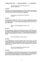 Drucksache 14/48 (14/15) Landtag des Saarlandes - 14. Wahlperiode - Wie viele Proben wurden wann untersucht und mit welchen Ergebnissen? Zu Frage 2: Bislang sind 37 Proben Weihnachtsgebäck und 4 Proben sonstiger Lebensmittel der Laboruntersuchung zugeleitet worden. Ergebnisse liegen jetzt vor. Von den insgesamt 41 Proben sind sechs, also etwa jede siebente zu beanstanden Wie oft wurden die Grenzwerte von Cumarin über- schritten? Zu Frage 3: Sechsmal wurden Grenzwerte, die sich aus der neuen Europäischen Verordnung Nr. 1334/2008 (Verordnung über „Aromen und bestimmte Lebensmittelzutaten mit Aromaeigenschaften …“ vom 16. Dezember 2008, Amtsblatt der EU L 354 S. 34) er- geben, überschritten. Gab es Kennzeichnungsprobleme? Wenn ja, wel- che? Zu Frage 4: Bei 8 Fertigpackungen entsprach die Kennzeichnung nicht den Anforderungen der Le- bensmittel-Kennzeichnungsverordnung. Überwiegend handelte es sich um Mängel bei der Angabe des Mindesthaltbarkeitsdatums und unvollständige Herstellerangaben (5 Proben), fehlerhafte Zutatenliste (1 Probe) bzw. gänzlich fehlende Kennzeichnung (2 Proben). Gab es Rückrufaktionen? Wenn ja, warum? Zu Frage 5: Ein Herstellerbetrieb war mit 2 Proben untersucht worden, die mit 114 bzw. 115 mg/kg Cumarin übermäßig hohe Gehalte aufwiesen. Wegen nicht auszuschließender Ge- sundheitsgefahr mussten die dazugehörigen Chargen vernichtet werden. Eine Rück- rufaktion war nicht durchgeführt worden, weil davon auszugehen war, dass die Ware bereits verzehrt ist. Gab es eine Verschärfung der Kontrollen? Wenn ja, wann, wenn nein, warum nicht? Zu Frage 6: In der Vorbemerkung ist bereits erwähnt worden, dass für Cumarin in Lebensmitteln eine neue Bewertung gilt, die höhere Cumaringehalte zulässt. Aus diesem Grund und weil die diesjährige Beprobungsaktion keine Verschlechterung des Gesamtbildes er- geben hat, kann auf eine Verschärfung der Kontrollen verzichtet werden. -2-