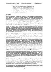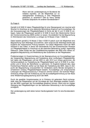 Drucksache 15/1687 (15/1630) Landtag des Saarlandes - 15. Wahlperiode - Wann wird die Landesregierung im Bundesrat die Initiative ergreifen, um die Möglichkeit zur vo- rübergehenden Einweisung in eine Pflegestufe gesetzlich zu verankern? Gibt es hierzu bereits konkrete Gespräche mit anderen Bundesländern? Zu Frage 4: Gemäß § 42 SGB XI haben Pflegebedürftige für eine Übergangszeit von maximal acht Wochen im Anschluss an eine stationäre Behandlung Anspruch auf Kurzzeitpflege. Ob die Voraussetzungen der Pflegebedürftigkeit im Sinne der §§ 14 und 15 SGB XI vor- liegen, haben die Pflegekassen gemäß § 18 SGB XI durch den Medizinischen Dienst der Krankenversicherung (MDK) prüfen zu lassen. Grundsätzlich hat die Begutachtung im Wohnbereich des Versicherten zu erfolgen (§ 18 Absatz 2 Satz 1 SGB XI). Dabei besteht gemäß § 18 Absatz 2 Satz 4 SGB XI jedoch auch die Möglichkeit eine Begutachtung nach Aktenlage vorzunehmen, wenn aufgrund der Aktenlage bereits das Ergebnis der medizinischen Prüfung feststeht. Von dieser Möglichkeit macht der MDK Saarland in den Fällen, in denen der behandelnde Arzt des Krankenhauses Hinweise zur Pflegebedürftigkeit im Anschluss an die stationäre Behandlung vorlegt, regelmäßig Gebrauch. Dabei erfolgt laut den Qualitätssicherungsdaten des MDK eine nahezu ta- gesgleiche Begutachtung und Weiterleitung des Gutachtens an die Pflegekassen. Problemanzeigen im Zusammenhang mit der Beanspruchung von Kurzzeitpflege bzgl. der fristgerechten Begutachtung und Feststellung einer (vorläufigen) Pflegebedürftig- keit haben die Pflegekassen und der MDK im Jahr 2012 zum Anlass genommen, die Verfahrensabläufe zur Feststellung der Pflegebedürftigkeit nach § 18 SGB XI zu über- prüfen und im Sinne der Betroffenen zu optimieren. Im Ergebnis bedeutet dies, dass Krankenhaus-Patienten seither auf der Basis der Feststellung des MDK, dass im Zeit- punkt der Begutachtung voraussichtlich für mindestens sechs Monate wenigstens in erheblichem Umfang Pflegebedürftigkeit besteht, Kurzzeitpflege und entsprechende Leistungen der Pflegeversicherung in Anspruch nehmen können. Die konkrete Pflege- einstufung erfolgt nach der Entlassung aus der Kurzzeitpflegeeinrichtung auf der Basis einer Wiederholungsbegutachtung durch den MDK. Durch die gewählte Vorgehensweise ist im Einklang mit geltendem Recht sicherge- stellt, dass die Pflegekassen auf der Grundlage der nach Aktenlage erstellten Gutach- ten des MDK Leistungen der Kurzzeitpflege gewähren können. Damit wird ein zügiger Übergang des Pflegebedürftigen von der stationären Behandlung in die Kurzzeitpflege ermöglicht. Die Landesregierung sieht daher keinen Handlungsbedarf mehr für eine Bundesratsini- tiative. -4-
