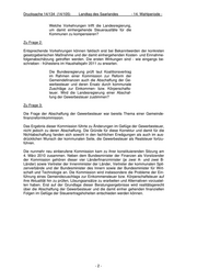 Drucksache 14/134 (14/105) Landtag des Saarlandes - 14. Wahlperiode - Welche Vorkehrungen trifft die Landesregierung, um damit einhergehende Steuerausfälle für die Kommunen zu kompensieren? Zu Frage 2: Entsprechende Vorkehrungen können faktisch erst bei Bekanntwerden der konkreten gesetzgeberischen Maßnahme und der damit einhergehenden Kosten- und Einnahme- folgenabschätzung getroffen werden. Die ersten Wirkungen sind - wie eingangs be- schrieben - frühestens im Haushaltsjahr 2011 zu erwarten. Die Bundesregierung prüft laut Koalitionsvertrag im Rahmen einer Kommission zur Reform der Gemeindefinanzen auch die Abschaffung der Ge- werbesteuer und deren Ersatz durch kommunale Zuschläge zur Einkommen- bzw. Körperschafts- teuer. Wird die Landesregierung einer Abschaf- fung der Gewerbesteuer zustimmen? Zu Frage 3: Die Frage der Abschaffung der Gewerbesteuer war bereits Thema einer Gemeinde- finanzreformkommission. Das Ergebnis dieser Kommission führte zu Änderungen im Gefüge der Gewerbesteuer, nicht jedoch zu deren Abschaffung. Die Gründe für diese Korrektur und damit für die Nichtabschaffung fanden sich sowohl in den fachlichen Erwägungen als auch im aus- drücklichen Wunsch der kommunalen Seite, die Gewerbesteuer als Realsteuer fortzu- führen. Die nunmehr neu einberufene Kommission kam zu ihrer konstituierenden Sitzung am 4. März 2010 zusammen. Neben dem Bundesminister der Finanzen als Vorsitzender der Kommission gehören dieser vier Länderfinanzminister (je zwei A- und zwei B- Länder) sowie Vertreter der Innenminister der Länder, Vertreter der kommunalen Spit- zenverbände und der Bundesminister des Innern sowie der Bundesminister für Wirt- schaft und Technologie an. Die Kommission wird insbesondere die Probleme der Ein- führung eines Gemeindezuschlags zur Einkommensteuer bzw. Körperschaftsteuer auf ihre Aktualität hin zu prüfen, Lösungsansätze zu erarbeiten und Alternativen vorzustel- len haben. Erst auf der Grundlage dieser Beratungsergebnisse wird realitätsgerecht über die Abschaffung der Gewerbesteuer und die damit einher gehenden finanziellen Folgen im Gefüge der Steuerertragshoheiten entschieden werden können. -2-