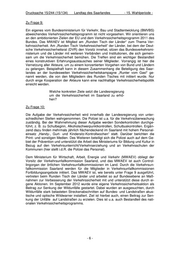 Drucksache 15/244 (15/134) Landtag des Saarlandes - 15. Wahlperiode - Verkehrserzeugung minimieren: Verkehr wird individuell (Haushalt) und kollektiv (Personen und Güter in Unter- nehmen, Bauleitplanung) erzeugt. Wie viel Verkehr erzeugt wird, ist generell auf verschiedenen Ebenen steuerbar. Die Minimierung der Verkehrserzeugung ist deshalb ein wichtiges Ziel einer nachhaltigen Mobilität. Mobilitätsstile und Mobilitätsplanungsstile verändern: Mobilität wird erlernt, in Planungsprozessen geregelt, in Verhaltensmustern eingeübt, über Medien wahrgenommen und über Generationen hinweg repro- duziert. Um nicht-nachhaltige Muster von Mobilitätsstilen und Mobilitätspla- nungsstilen zu durchbrechen, sind Bürgern, Planern, öffentlicher Verwaltung und Unternehmen zielgerichtet Information, Unterstützung und Begleitung an- zubieten. Grenzen mitdenken und überwinden: Ein Teil des Alltags- und des Freizeitverkehrs hat seine Quellen nicht im Saar- land selbst. Um Einfluss auf diesen Verkehr zu nehmen, sind strategische Alli- anzen einer nachhaltigen Mobilität aufzubauen. In welchem Zeitrahmen gedenkt die Landesregie- rung solche Ziele umzusetzen? Zu Frage 6: Die Umsetzung dieser Ziele ist kontinuierlicher Bestandteil der saarländischen Ver- kehrspolitik und Grundlage ihres Handelns. Werden explizit diesbezügliche Nachhaltigkeitszie- le in der Fortschreibung des saarländischen Ver- kehrsentwicklungsplans (VEP) verankert? Werden explizit diesbezügliche Nachhaltigkeitszie- le bei der Novellierung des ÖPNVG verankert? Zu den Fragen 7 und 8: Die Fragen 7 und 8 werden aufgrund ihres Sachzusammenhanges gemeinsam beant- wortet. Die Inhalte des VEP und des ÖPNVG auch hinsichtlich von Nachhaltigkeitszielen wer- den im Rahmen der vorgesehenen Fortschreibung des VEP bzw. der Novellierung des ÖPNVG festgelegt. Nachhaltigkeitsziele werden daher selbstverständlich eine Rolle spielen. Wann will die Landesregierung die von der EU und dem Bund vorgegebenen Verkehrssicher- heitsziele (Zielhorizont 2020) in einem Verkehrssi- cherheitsprogramm fest-schreiben? -5-
