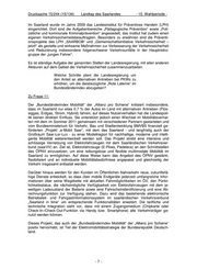 Drucksache 15/244 (15/134) Landtag des Saarlandes - 15. Wahlperiode - Im Saarland wurde im Jahre 2009 das Landesinstitut für Präventives Handeln (LPH) eingerichtet. Dort sind die Aufgabenbereiche „Pädagogische Prävention“ sowie „Poli- zeiliche und kommunale Kriminalprävention“ angesiedelt; das Institut hat zudem einen eigenen Verkehrssicherheitsbeauftragten. Besonders zu erwähnen sind die Präventi- onsprojekte des LPH „SAARBOB“ und „Gemeinschaftsinitiative Verkehrssicherheit – jetzt!“ als gezielte und wirksame Maßnahmen zur Verbesserung der Verkehrssicherheit und Reduzierung insbesondere folgenschwerer Verkehrsunfälle in der Hauptrisiko- gruppe der „jungen Fahrer“. Es ist ständige Aufgabe der genannten Stellen der Landesregierung, mit allen anderen Akteuren auf dem Gebiet der Verkehrssicherheit zusammenzuarbeiten. Welche Schritte plant die Landesregierung um den Anteil an alternativen Antrieben bei PKWs zu erhöhen, um die diesbezügliche „Rote Laterne“ im Bundesländerindex abzugeben? Zu Frage 11: Der „Bundesländerindex Mobilität“ der „Allianz pro Schiene“ kritisiert insbesondere, dass im Saarland nur etwa 0,7 % der Autos im Land mit alternativen Antrieben (Flüs- siggas, Erdgas, Strom, Hybrid) fahren; auf dieses Nutzerverhalten hat die Landespoli- tik keinen direkten Einfluss. Sie unterstützt jedoch einen Wechsel im Mobilitätsverhal- ten mit dem im Sommer 2011 gemeinsam mit verschiedenen Partnern gestarteten und vom Bundesministerium für Verkehr, Bau und Stadtentwicklung BMVBS finanziell ge- förderten „Projekt „e-Mobil Saar“, mit dem das Saarland - und langfristig auch der Großraum Saar-Lor-Lux - zu einer Modellregion für nachhaltige, moderne und intelli- gente Mobilität weiterentwickelt werden soll. Das Projekt strebt eine intensive und schlüssige Vernetzung von Elektrofahrzeugen mit dem Saarländischen Verkehrsver- bund (saarVV) an. Ziel ist, Elektrofahrzeuge (E-Pkws, Pedelecs) an den Schnittstellen des ÖPNV einzusetzen, um eine reibungslose und flexible multimodale Mobilität im Saarland zu ermöglichen. Auf diese Weise kann das Angebot des ÖPNV gestärkt, flexibilisiert und an individuelle Mobilitätsbedürfnisse angepasst und gleichzeitig der Verkehr insgesamt entlastet werden. Darüber hinaus werden für den Kunden im Öffentlichen Nahverkehr neue, zukunftsfä- hige Dienste entwickelt, so dass über mobile Endgeräte jederzeit umfangreiche Infor- mationen über seine Wegekette mit aktuellen Fahrmöglichkeiten im ÖV, den Pünkt- lichkeitsstatus, die nächstmögliche Verfügbarkeit von Elektrofahrzeugen mit dem je- weiligen Ladezustand der Batterie sowie eine Fahrscheinidentifizierung und eine Ab- rechnungsfunktion zur Verfügung stehen. Dazu wird das bestehende elektronische Betriebsleit- und Fahrgastinformationssystem im saarländischen Verkehrsverbund „Saarland in time“ um entsprechende Funktionalitäten erweitert. Die tarifliche und technische Integration sieht vor, dass mit einem Zugangsmedium (Chipkarte oder Check-In-/Check-Out-Funktion via Handy bzw. Smartphone) alle Verkehrsträger ge- nutzt werden können. Dieses Projekt, das auch der „Bundesländerindex Mobilität“ der „Allianz pro Schiene“ positiv hervorhebt, ist Teil der Elektromobilitätsstrategie der Bundesrepublik Deutsch- land. -7-