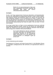 Drucksache 15/720 (15/660) Landtag des Saarlandes - 15. Wahlperiode - Welche Art von (personenbezogenen) Daten spei- chern saarländische Kommunen außerhalb des Saarlandes? Bitte jeweils nach Kommu- ne/Bundesland/Staat aufschlüsseln. Zu Frage 8: Da die in der Frage angesprochenen Kommunen (Gemeinden und Gemeindeverbän- de) keine der Landesregierung nachgeordneten Behörden, sondern rechtlich selbstän- dige juristische Personen des öffentlichen Rechts sind, nehmen die Kommunen die ihnen obliegenden Aufgaben, so auch die Speicherung von Daten, in eigener Verant- wortung unter Bindung an die Gesetze war. Es besteht keine unmittelbare oder mittel- bare Zuständigkeit der Landesregierung für die IT-Organisation der Kommunen. Auf die kommunale Selbstverwaltung nach Artikel 28 Absatz 2 GG und Artikel 118 SVerf wird verwiesen. Ob und ggf. welche Arten von Daten von den saarländischen Kommunen außerhalb des Saarlandes gespeichert werden, entzieht sich der Kenntnis der Landesregierung. Wegen der Vielzahl der bei den Kommunen gelagerten Datenarten würde die gefor- derte Umfrage einen erheblichen Mehraufwand bedeuten. Durch welche Maßnahmen stellt die Landesregie- rung sicher, dass Daten ihrer Ministerien und un- tergeordneten Behörden auf den Übertragungs- wegen untereinander und zu den Speicher- bzw. Verarbeitungsorten vor unbefugtem Zugriff ge- schützt sind? Zu Frage 9: Auf die Vorbemerkung wird verwiesen. Das Ministerium für Finanzen und Europa ist gerne bereit, in nicht-öffentlicher Sitzung im zuständigen Landtagsausschuss über technische und organisatorische Details zu berichten. -6-