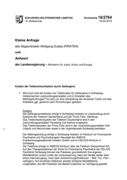 SCHLESWIG-HOLSTEINISCHER LANDTAG Drucksache 18/2764 18. Wahlperiode 16.03.2015 Kleine Anfrage des Abgeordneten Wolfgang Dudda (PIRATEN) und Antwort der Landesregierung – Ministerin für Justiz, Kultur und Europa Kosten der Telekommunikation durch Gefangene 1. Wie hoch sind die Kosten von Telefonaten für Gefangene in Schleswig- Holsteinischen Justizvollzugsanstalten und in Anstalten des Maßregelvollzuges? Es wird um eine Darstellung der einzelnen Tarife und des Anbieters ggf. getrennt nach Einrichtungen gebeten. Antwort: Die Gefangenentelefonie erfolgt in Schleswig-Holstein im Justizvollzug durch Systeme der Telekom Deutschland und der Firma Telio, Hamburg. Das Telefonkartensystem der Telekom Deutschland wird in den Justizvollzugsanstalten Flensburg und Itzehoe eingesetzt. Das Telefoniesystem der Firma Telio wird in den Justizvollzugsanstalten Kiel, Lübeck und Neumünster sowie in der Jugendanstalt Schleswig betrieben. Der Maßregelvollzug erfolgt in Schleswig Holstein im Klinikum für Forensische Psychiatrie und Psychotherapien Neustadt der AMEOS Krankenhausgesellschaft Holstein GmbH und im HELIOS Klinikum in Schleswig. Die Telefonie erfolgt im AMEOS Klinikum über die Telekom Deutschland AG. Auf den Therapiestationen der Klinik für Forensische Psychiatrie der HELIOS Fachklinik Schleswig können die Patienten grundsätzlich ihre eigenen Mobiltelefone nutzen (unter der Voraussetzung, dass die Geräte weder über einen Internetzugang, noch über Aufzeichnungsfunktionen – Bild, Ton, Film – verfügen). Auf einzelnen Stationen werden einfache Mobiltelefone vorgehalten, die den Patienten bei Bedarf kostenlos zur Verfügung gestellt