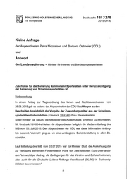 Drucksache 18/3378 Schleswig-Holsteinischer Landtag - 18. Wahlperiode Dies vorausgeschickt, fragen wir die Landesregierung: 1. 2. a.) Welche Kommunen haben respektive werden noch in welcher Höhe Förder- mittel für welche konkreten Maßnahmen in welchen Schwimmsportstätten er- halten? Antwort: Ergänzend zu den Erläuterungen des Ministeriums für Inneres und Bundesan- gelegenheiten in der Sitzung des Innen- und Rechtsausschusses am 9.09.2015 gibt die Anlage 1 einen schriftlichen Überblick über die Zuwen- dungsempfänger, die Schwimmsportstätten und die geförderten Maßnahmen einschließlich Höhe der beantragten und der gewährten Förderung. Das Amt Breitenburg hat seinen Antrag aufgrund der angespannten Finanzla- ge der Gemeinde nach ausgesprochener Bewilligung von 42.102 EUR am 26.08.2015 zurückgezogen. Ein Anteil dieser so wieder frei gewordenen Mittel konnte in Höhe von 26.750 EUR der Stadt Schenefeld ergänzend zugewendet werden. Die förderfähigen Maßnahmen in dem Schwimmbecken an der Gorch-Fock-Schule in Schenefeld können nun mit einem Zuschuss in Höhe von 74.500 EUR gefördert werden. | Welche Kommunen haben für welche konkret beantragten Maßnahmen in welcher Höhe einen ab- lehnenden Bescheid erhalten? b.) wie hoch war der Gesamtinvestitionsbedarf der Maßnahmen und die wie hoch die Fehlbetragssumme? c.) mit welcher Begründung wurden die Ablehnungsbescheide erteilt? Antwort: zu a) In der Anlage 2 wird dargestellt, welche Antragsteller einen ablehnenden Bescheid erhalten haben. zu b) Die Gesamtkosten aller beantragten Maßnahmen ergeben sich aus den Anlagen 1 und 2. Der beantragte Investitionsbedarf aller Anträge beträgt 4.188.601,22 EUR bei einem Gesamtfördervolumen von bis zu 2 Mio. EUR. zu c) In den ablehnenden Bescheiden wurde den Antragstellern mitgeteilt,