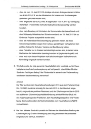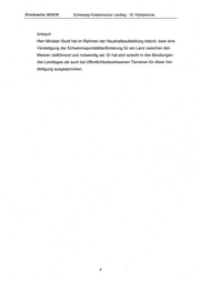 Schleswig-Holsteinischer Landtag - 18. Wahlperiode Drucksache 18/3378 - dass bis zum 15. Juni 2015 35 Anträge mit einem Antragsvolumen in Höhe von 4.069.311,62 €. an das Ministerium für Inneres und Bundesangele- genheiten gerichtet worden sind, - dass angesichts der auf 2,0 Mio. € begrenzten - nur in 2015 zur Verfügung stehenden - Fördermittel nicht alle Maßnahmen berücksichtigt werden konnten, - dass nach Beratung mit Vertretern der Kommunalen Landesverbände und dem Schleswig-Holsteinischen Schwimmverband am 19. Juni 2015 die zu fördernde Projekte ausgewählt worden sind, | - dass alle Hallenbäder Berücksichtigung gefunden haben, da diese Schwimmsportstätten wegen ihrer nahezu ganzjährigen Verfügbarkeit den größten Nutzen für Schulen, Vereine und Bevölkerung hätten, - dass Freibäder nur in Kreisen berücksichtigt worden sind, in denen keine Maßnahme für Hallenbäder beantragt worden ist (regionaler Aspekt) und - dass auch von diesen Projekten nicht alle beantragten Maßnahmen als förderfähig eingestuft werden konnten. .. Weshalb wurde der obig genannte Haushaltstitel nicht verstetigt und im Haus- haltsplanentwurf der Landesregierung auf null gesetzt, obwohl Herr Minister Studt den "wichtigen Beitrag" der Fördermittel in seiner in der Vorbemerkung erwähnten Medienmitteilung hervorhob? Antwort: Der Titel wurde in den Haushaltsverhandlungen 2015 aus dem Parlament (vgl. Drs. 18/2480) zunächst einmalig für das Jahr 2015 in den Haushalt einge- bracht. Aufgrund der positiven Resonanz und der Erfahrungen mit der in 2015 neu etablierten (Schwimm)sportstättenförderung erörtert Minister Studt mit den regierungstragenden Fraktionen, dem Haushaltsgesetzgeber eine Verste- tigung des Ansatzes über die Nachschiebeliste zum Haushaltsentwurf 2016 vorzuschlagen. . Hat Herr Minister Studt sich proaktiv im Rahmen der Haushaltsaufstellung der Landesregierung für eine Verstetigung des obig genannten Haushaltstitels eingesetzt und wenn ja, inwiefern?