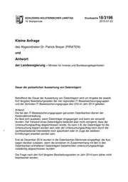 SCHLESWIG-HOLSTEINISCHER LANDTAG Drucksache 18/3198 18. Wahlperiode 2015-07-23 Kleine Anfrage des Abgeordneten Dr. Patrick Breyer (PIRATEN) und Antwort der Landesregierung – Minister für Inneres und Bundesangelegenheiten Dauer der polizeilichen Auswertung von Datenträgern Betreffend der Dauer der Auswertung von Datenträgern wird um Angabe der jeweils fünf längsten Bearbeitungszeiten der vier regionalen IT-Beweissicherungsgruppen und der Zentralen IT-Beweissicherungsgruppe des LKA im Jahr 2014 gebeten. Antwort: Die bei den IT-Beweissicherungsgruppen genutzten Datenbanken dienen der Asservatenverwaltung. Es lässt sich auslesen, wann Datenträger eingegangen und wann sie versandt wurden. Der Versand eines Datenträgers bedeutet aber nicht zwingend, dass der Untersuchungsauftrag abgeschlossen wurde. So kann z.B. der Datenträger für die Untersuchung kopiert worden sein oder der Untersuchungsauftrag kann durch die sachbearbeitende Dienststelle noch spezifiziert oder im Zuge der weiteren Ermittlungen erweitert worden sein. Erst ab Dezember 2014 wurden in die Datenbanken Merkmale eingepflegt, die Aus- sagen darüber zulassen, wann die einzelnen im Zusammenhang mit den in den Datenbanken enthaltenen Datenträgern bestehenden Untersuchungsaufträge vollständig abgeschlossen wurden. Die Frage nach den fünf längsten Bearbeitungszeiten im Jahr 2014 kann daher nicht beantwortet werden.