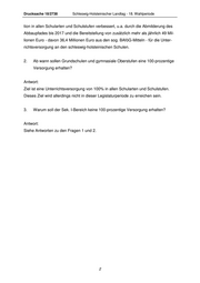 SCHLESWIG-HOLSTEINISCHER LANDTAG Drucksache 18/2738 18. Wahlperiode 2015-03-05 Kleine Anfrage der Abgeordneten Heike Franzen (CDU) und Antwort der Landesregierung - Ministerin für Schule und Berufsbildung Unterrichtsversorgung Vorbemerkung der Fragestellerin: Laut Berichterstattung der Lübecker Nachrichten vom 6. Februar 2015 hat Bildungs- ministerin Ernst auf einer Veranstaltung hinsichtlich ihrer Priorisierung bei der Unter- richtsversorgung erklärt, dass Grundschulen und gymnasiale Oberstufen eine 100- prozentige Versorgung haben sollen. 1. Welche Maßnahmen wird die Landesregierung ergreifen, damit Grundschulen und gymnasiale Oberstufen eine 100-prozentige Versorgung erhalten (bitte nach Schularten aufschlüsseln)? Antwort: Bei den Grundschulen macht die in der Schulartverordnung vorgegebene „Verläss- lichkeit“ eine 100-prozentige Versorgung unabdingbar. Vergleichbares gilt für die gymnasiale Oberstufe, bei der Einbringungs- und Belegpflichten erfüllt werden müs- sen, damit ein der Oberstufen- und Abiturprüfungsverordnung sowie den Vereinba- rungen im Rahmen der Kultusministerkonferenz entsprechendes Abitur erreicht wer- den kann. Insgesamt wird in dieser Legislaturperiode sukzessive die Unterrichtssitua-