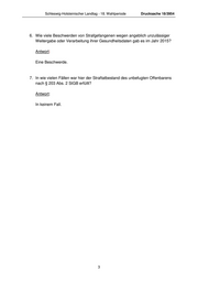 Schleswig-Holsteinischer Landtag - 18. Wahlperiode Drucksache 18/3954 6. Wie viele Beschwerden von Strafgefangenen wegen angeblich unzulässiger Weitergabe oder Verarbeitung ihrer Gesundheitsdaten gab es im Jahr 2015? Antwort: Eine Beschwerde. 7. In wie vielen Fällen war hier der Straftatbestand des unbefugten Offenbarens nach § 203 Abs. 2 StGB erfüllt? Antwort: In keinem Fall. 3