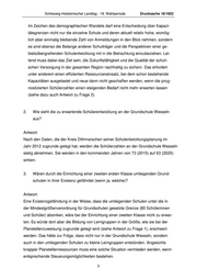 Schleswig-Holsteinischer Landtag - 18. Wahlperiode Drucksache 18/1602 Im Zeichen des demographischen Wandels darf eine Entscheidung über Kapazi- tätsgrenzen nicht nur die einzelne Schule und deren aktuell relativ hohe, womög- lich aber einmalig bleibende Zahl von Anmeldungen in den Blick nehmen, sondern es sind ebenso die Belange anderer Schulträger und die Perspektiven einer ge- bietsübergreifenden Schulentwicklung mit in die Betrachtung einzubeziehen. Lei- tend muss dabei das Ziel sein, die Zukunftsfähigkeit und die Qualität der schuli- schen Versorgung in der gesamten Region nachhaltig zu sichern. Das erfordert unter anderem einen effizienten Ressourceneinsatz, bei dem schon bestehende Kapazitäten ausgelastet und neue dann nicht geschaffen werden, wenn die prog- nostizierten Schülerzahlen einen steigenden Bedarf nicht mehr erwarten lassen (siehe dazu auch Antwort zu Frage 2). 2. Wie sieht die zu erwartende Schülerentwicklung an der Grundschule Wesseln aus? Antwort: Nach den Daten, die der Kreis Dithmarschen seiner Schulentwicklungsplanung im Jahr 2012 zugrunde gelegt hat, werden die Schülerzahlen an der Grundschule Wesseln stetig abnehmen. Sie werden in den kommenden Jahren von 73 (2015) auf 63 (2025) sinken. 3. Wären durch die Einrichtung einer zweiten ersten Klasse umliegenden Grund- schulen in ihrer Existenz gefährdet (wenn ja, welche)? Antwort: Eine Existenzgefährdung in der Weise, dass die umliegenden Schulen unter die in der Mindestgrößenverordnung für Grundschulen gesetzte Grenze (80 Schülerinnen und Schüler) absinken, wäre bei der Einrichtung einer zweiten Klasse nicht zu erwar- ten. Es würde dort aber die Bildung von Lerngruppen in der Größe, wie sie bei der Planstellenzuweisung zugrunde gelegt wird (siehe Antwort zu Frage 1), erschwert werden. Das hätte zur Folge, dass nicht nur in der Grundschule Wesseln, sondern auch in den umliegenden Schulen zu kleine Lerngruppen entstünden. Angesichts knapper Planstellenressourcen muss eine solche Situation vermieden werden, wenn entsprechende Steuerungsmöglichkeiten bestehen. 3