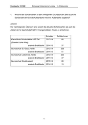 Drucksache 18/1602 Schleswig-Holsteinischer Landtag - 18. Wahlperiode 4. Wie sind die Schülerzahlen an den umliegenden Grundschulen (bitte auch die Schülerzahl der Grundschulstandorte mit einer Außenstelle angeben)? Antwort: Der nachfolgenden Übersicht sind sowohl die aktuellen Schülerzahlen als auch die Zahlen der für das Schuljahr 2014/15 angemeldeten Kinder zu entnehmen. Schuljahr Schüler/innen Klaus-Groth-Schule Heide - GS-Teil 2013/14 191 (Standort Loher Weg) avisierte Erstklässler 2014/15 37 Grundschule St.-Georg Heide 2013/14 206 avisierte Erstklässler 2014/15 51 Grundschule Lüttenheid, Heide 2013/14 200 avisierte Erstklässler 2014/15 37 Grundschule Weddingstedt 2013/14 83 avisierte Erstklässler 2014/15 19 4