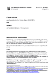 SCHLESWIG-HOLSTEINISCHER LANDTAG Drucksache 18/3291 18. Wahlperiode 13. August 2015 Kleine Anfrage des Abgeordneten Dr. Patrick Breyer (PIRATEN) und Antwort der Landesregierung - Ministerpräsident Geschäftsordnung der Landesministerien Vorbemerkung: Auf Bundesebene regelt eine Gemeinsame Geschäftsordnung der Bundes- ministerien (GGO) die Grundsätze für die Organisation der Ministerien, die Zusammenarbeit der Ministerien und mit den Verfassungsorganen sowie für den Geschäftsverkehr nach au- ßen. Sie regelt auch die Mitwirkung bei der Rechtsetzung. Gibt es im Land eine Geschäftsordnung der Landesministerien oder eine vergleichbare Re- gelung? Antwort: Die aktuelle Gemeinsame Geschäftsordnung für die Ministerien des Landes Schleswig- Holstein (GGO) wurde am 16.12.1997 als Vereinbarung mit den Spitzenorganisationen der Gewerkschaften nach § 59 des Gesetzes über die Mitbestimmung der Personalräte (Mitbe- 1 stimmungsgesetz Schleswig-Holstein - MBG Schl.-H.) abgeschlossen. Die GGO enthält Rahmenregelungen zur Aufbau- und Ablauforganisation der Ministerien, zu Arbeitsgrundsätzen und zur Zusammenarbeit mit Bund und Ländern. Die Arbeit der Landesregierung regelt die Geschäftsordnung der Landesregierung Schles- 2 wig-Holstein (GeschO LReg, GVOBl. Schl.-H. S 358) vom 19. August 2013 . Für die Änderung oder Neufassung von Vorschriften gelten die Richtlinien über Gesetz- und 3 Verordnungsentwürfe . 1 Siehe auch Schleswig-Holsteinischer Informationspool/SHIP unter Allgemeines/Organisation/Gemeinsame Geschäftsordnung (http://ship/-3.Allgemeines/-Organisation/-Gemeinsame_Geschäftsordnung/intranet.htm) 2 Siehe auch Schleswig-Holsteinischer Informationspool/SHIP unter Allgemeines/Organisation/Gemeinsame Geschäftsordnung der Landesregierung (http://sh.juris.de/cgi-bin/landesrecht.py?d=http://sh.juris.de/sh/RegGO_SH_rahmen.htm) 3 Siehe auch Schleswig-Holsteinischer Informationspool/SHIP unter Allgemeines/Handwerkszeug/Landesrecht mit Gesetzge- bungsrichtlinien/Richtlinien über Gesetz- und Verordnungsentwürfe (http://iv-ship/-2.Allgemeines/- Landesrecht_mit_Gesetzgebungsrichtlinien/richtlinien_gesetz_verordnungsentwuerfe/richtlinien.htm)