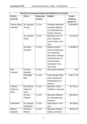 Drucksache 19/470 Schleswig-Holsteinischer Landtag - 19. Wahlperiode Übersicht und Zusammenstellung der Maßnahmen und Kosten Kirchen- Kirche Erbauungs- Schäden Kosten- gemeinde zeitraum schätzung gesamt in € Tönning, Kating, St. Laurentius, 12. Jhd. Gründung, Mauerwerk, 2.016.865,07 Kotzenbüll Tönning Verfugung, Maueran- ker, Dacheindeckung, Fenster, Innenraum St. Laurentius, 13. Jhd. Mauerwerk, Putz, An- 616.322,42 Kating strich, Dacheinde- ckung, Fenster, Innen- raum St. Nikolai, 14. Jhd. Statische Untersu- 3.736.685,15 Kotzenbüll chung, Nachgründung, Chor, Mauerwerk, Maueranker, Drainage, Dacheindeckung, De- ckenkonstruktion, Gussfenster, Innen- raum, Orgel Welt - St. Martin, 12. Jhd. ohne Sanierungsbedarf 0,00 Vollerwiek Vollerwiek St. Michael, 12. Jhd. Turmmauerwerk, Mau- 1.545.717,30 Welt erwerk, Maueranker, Dacheindeckung, In- nenraum Tetenbüll - St. Katharina, 12. Jhd. Mauerwerk, Außen- 427.733,01 Katharinen- Katharinen- holzflächen, Innenraum heerd heerd St. Anna, 12. Jhd. Mauerwerk, Maueran- 1.068.463,87 Tetenbüll ker, Dacheindeckung, Innenraum Koldenbüttel St. Leonhardt, 12. Jhd. Außenanstrich, Innen- 302.596,29 Koldenbüttel raum Witzwort - St. Marien, 15. Jhd. Mauerwerk, Dachein- 693.561,04 Uelvesbüll Witzwort deckung, Innenraum 2